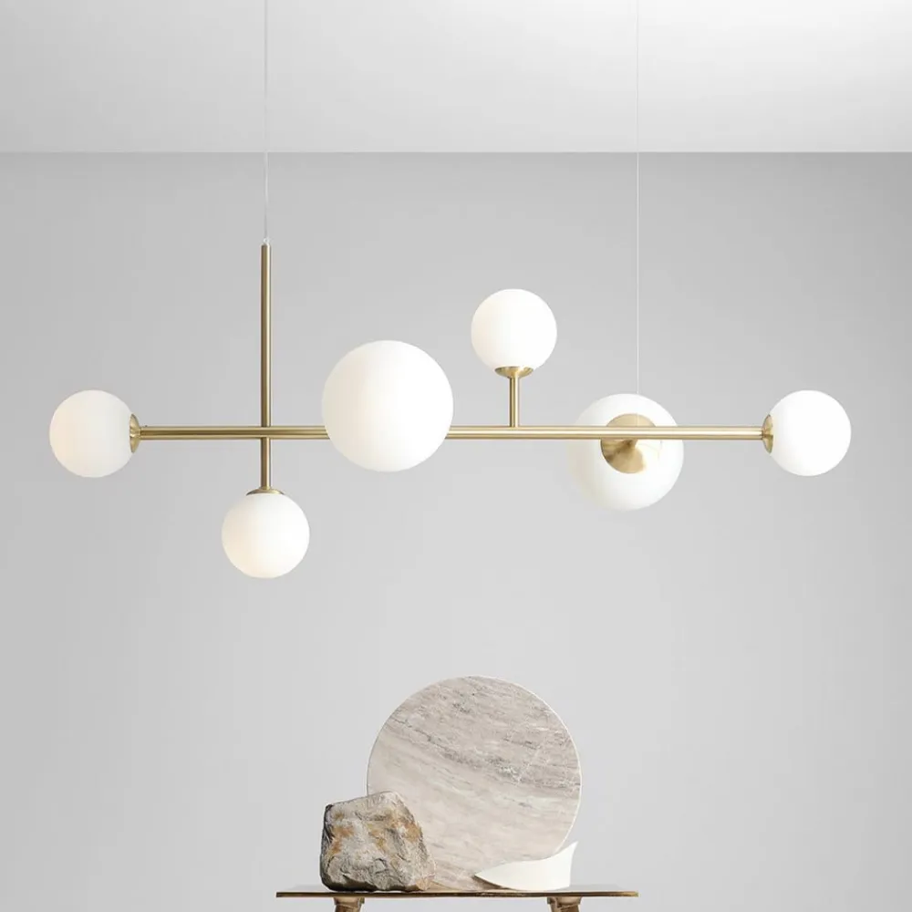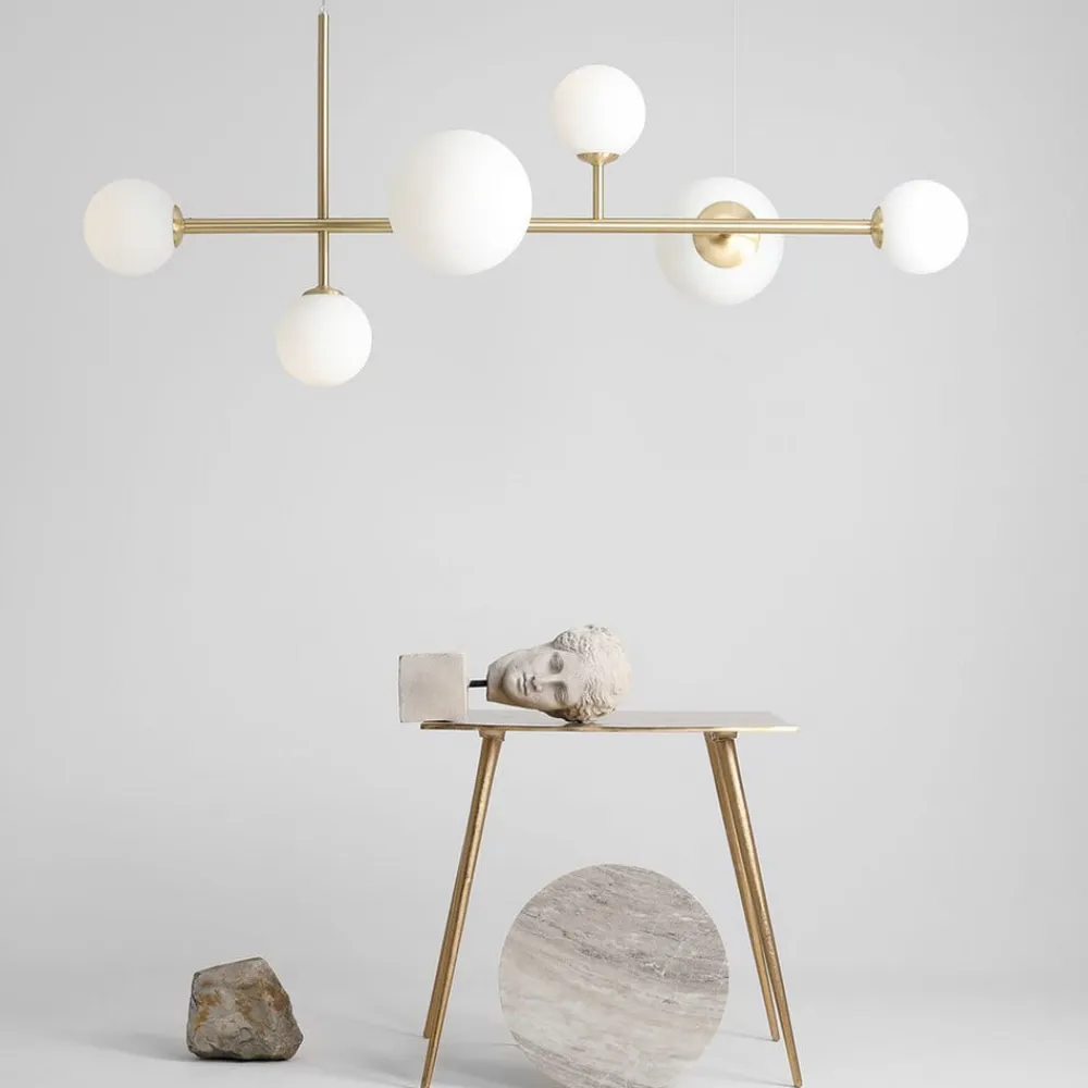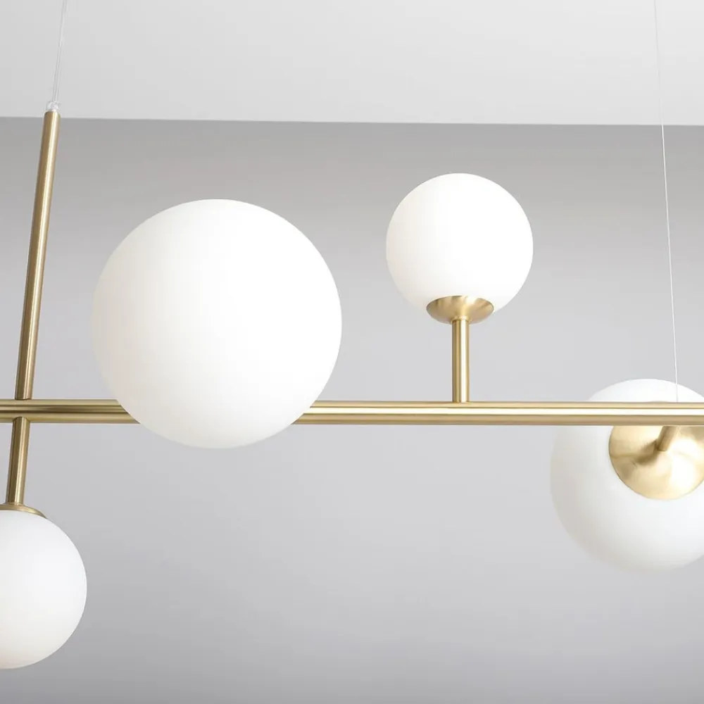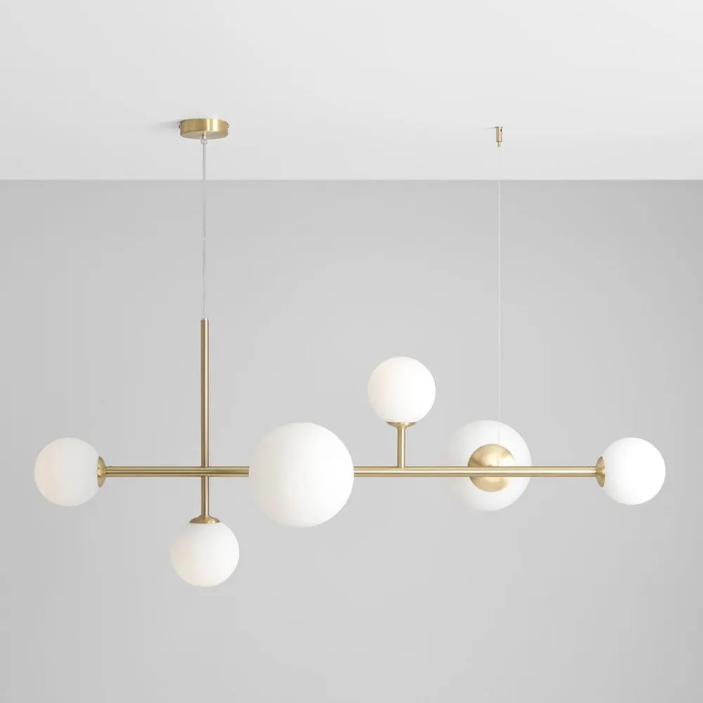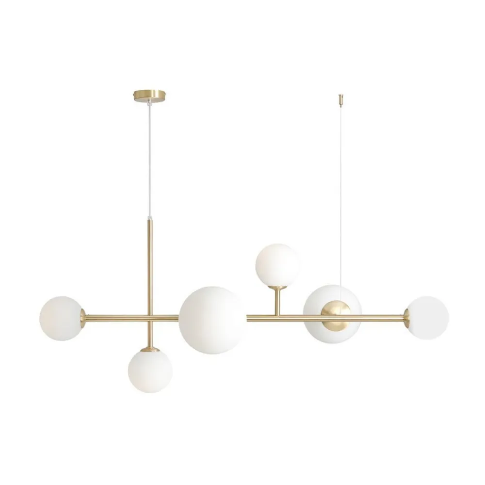 Hængelampen Joel i børstet messing og hvidt frostet glas forener tidløs elegance med funktionel alsidighed. Fremstillet af højkvalitets metal og glas passer denne 6 lyskilder lampe perfekt ind i stuen og spisestuen og giver ethvert rum en særlig atmosfære. Den omhyggelige udvælgelse af materialer og fremstillingen i Europa understreger lampens høje kvalitet og tiltalende design.