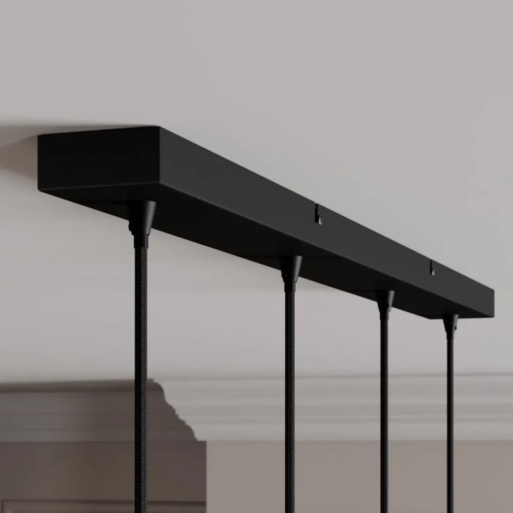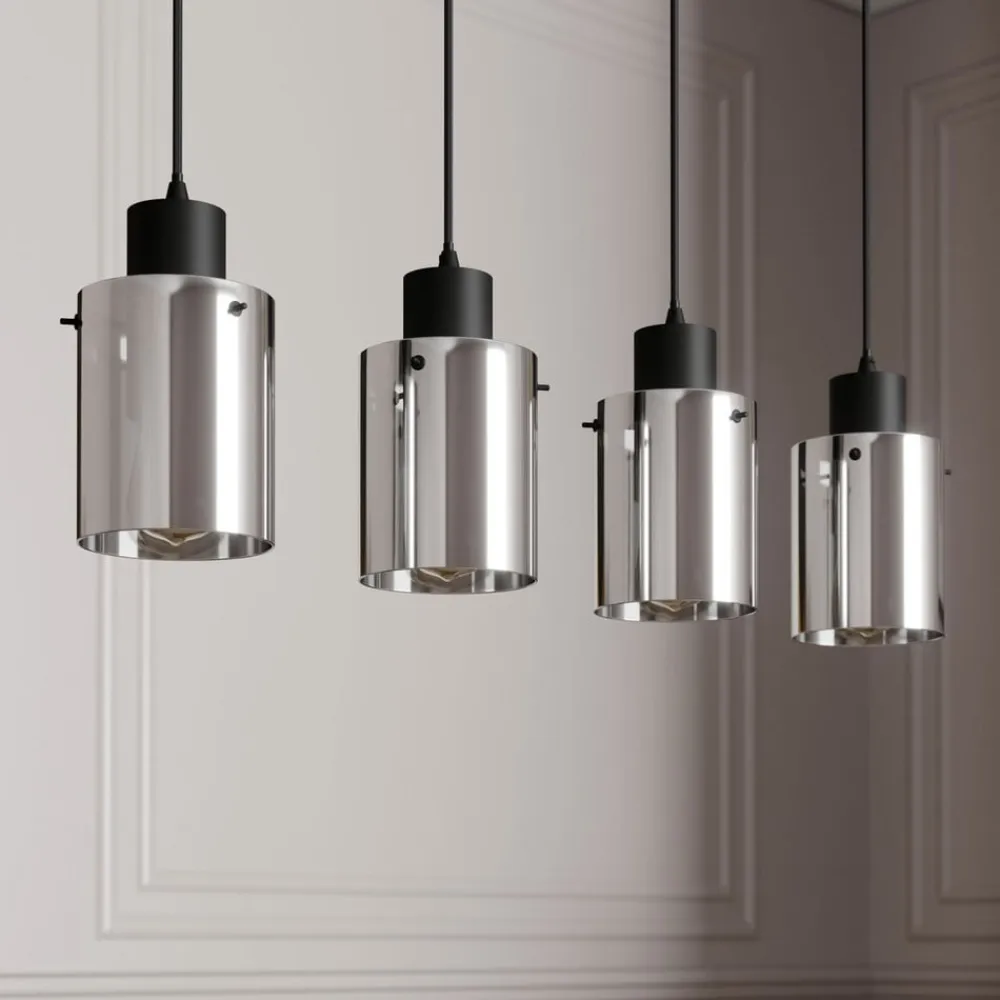Kourtney 4 lyskilder hængelampe med røget glaseffekt Kourtney hængelampen har fire lampeskærme af glas, som er fastgjort til et smalt ophæng. Hver lampeskærm har en skinnende overflade. Denne overflade er også kendt som et røget glas-look. Den giver indtryk af, at glasset er blevet farvet mørkt af flammen fra et stearinlys. Det har givet glasset sit navn. Denne overfladefinish er et trendy raffinement inden for belysnings- og indretningssektoren, som bliver mere og mere almindeligt i moderne miljøer. Derfor gør dette armatur også en god figur i en moderne stue eller spisestue. Det mørke glas betyder, at lyset kun spredes på en afdæmpet måde, hvilket skaber en behagelig og hyggelig atmosfære. Lyset kan slippe uhindret nedad, så f.eks. et bord bliver godt oplyst.
