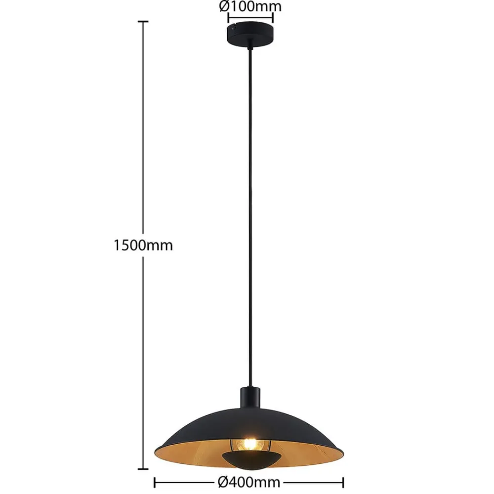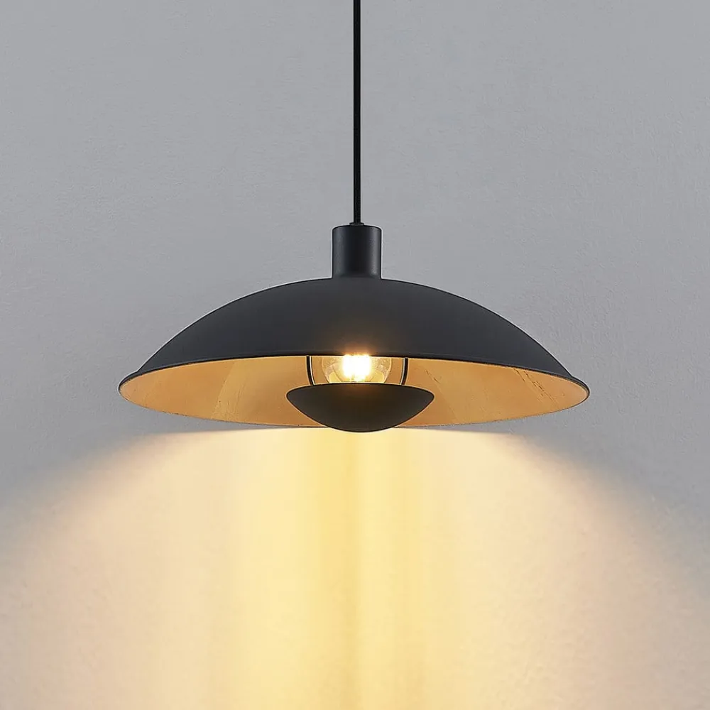 Rund, sort og guld Narisara hængelampe til stuen Denne hængelampe giver ikke kun et elegant look til stuen, men også en indbydende, hyggelig lyseffekt. Lampeskærmen ligner en flad kuppel og er lavet af jern, som er malet matsort på ydersiden og skinner gyldent på indersiden, hvilket også har en effektiv effekt på lyset. En kuppel under pæren giver indirekte lys og forstærker den hyggelige effekt af Narisara-pendlen.