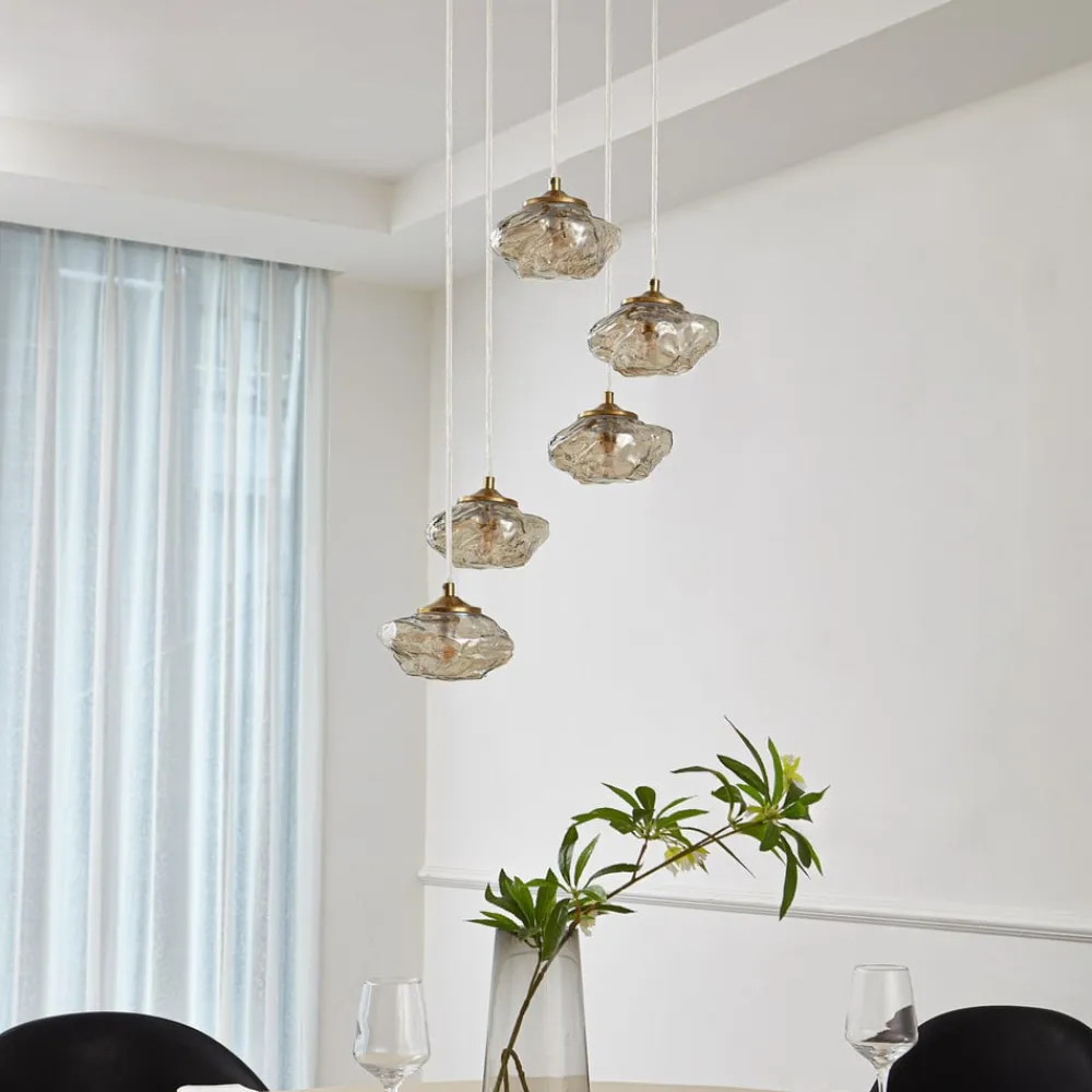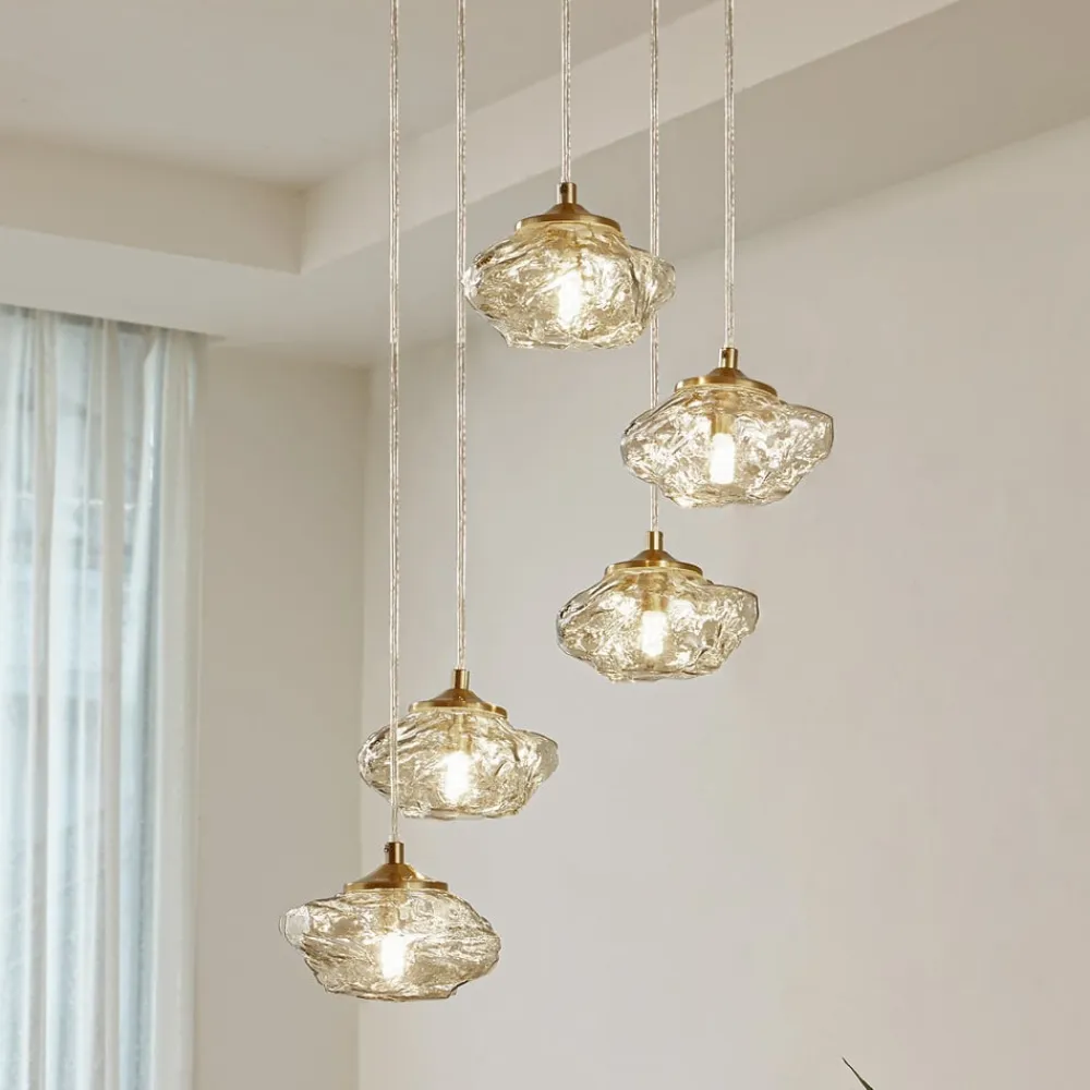 hængelampe Piatra, Ø45cm, 5 lyskilder, cognac/messing, glas^Lindby Outlet