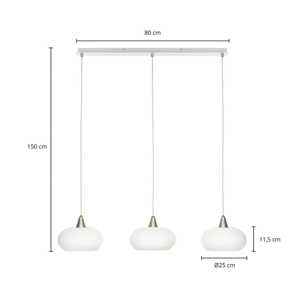 Sharvil 3 lyskilder pendellampe i opalhvid og nikkel – perfekt til spisebordet Den smukt designede Sharvil pendellampe er perfekt til dine fire vægge. Lyset kan dæmpes ved hjælp af en ekstern lysdæmper (medfølger ikke) eller en dæmpbar lyskilde. Uanset om det er i spisestuen eller stuen – denne hængelampe har også en plads i dit hjem. I Lucande-mærkekvalitet står denne lampe i moderne stil, designet af Ingo Thiele, for vellykket design og en overbevisende atmosfære. Sharvil-modellen er egnet til brug med lyskilder med E27-fatning, kommer i en imponerende nikkelfarve og kan også bruges som dekoration, når den er slukket.