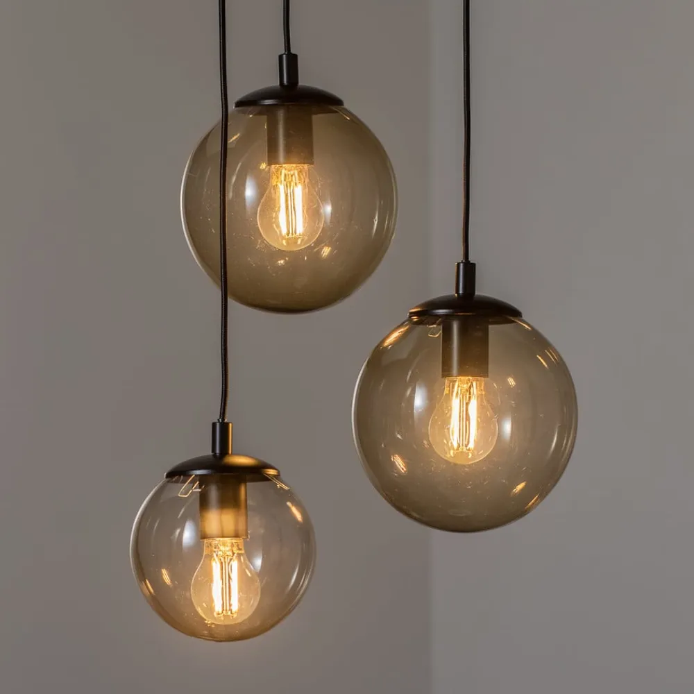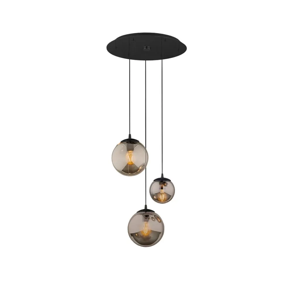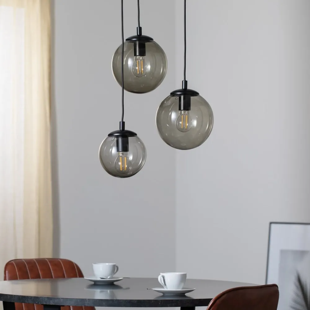 Hængelampen Smoky med sine 3 lyskilder i glas forener stilfuld elegance med funktionel als. Lampen er fremstillet af højkvalitetsstål og glas og præsenterer sig i et tiltalende røggråt og sort design, der gør indtryk både i stuen og i spisestuen. Lampen, der er fremstillet i Europa, overbeviser med sin omhyggelige forarbejdning og brugen af førsteklasses materialer.