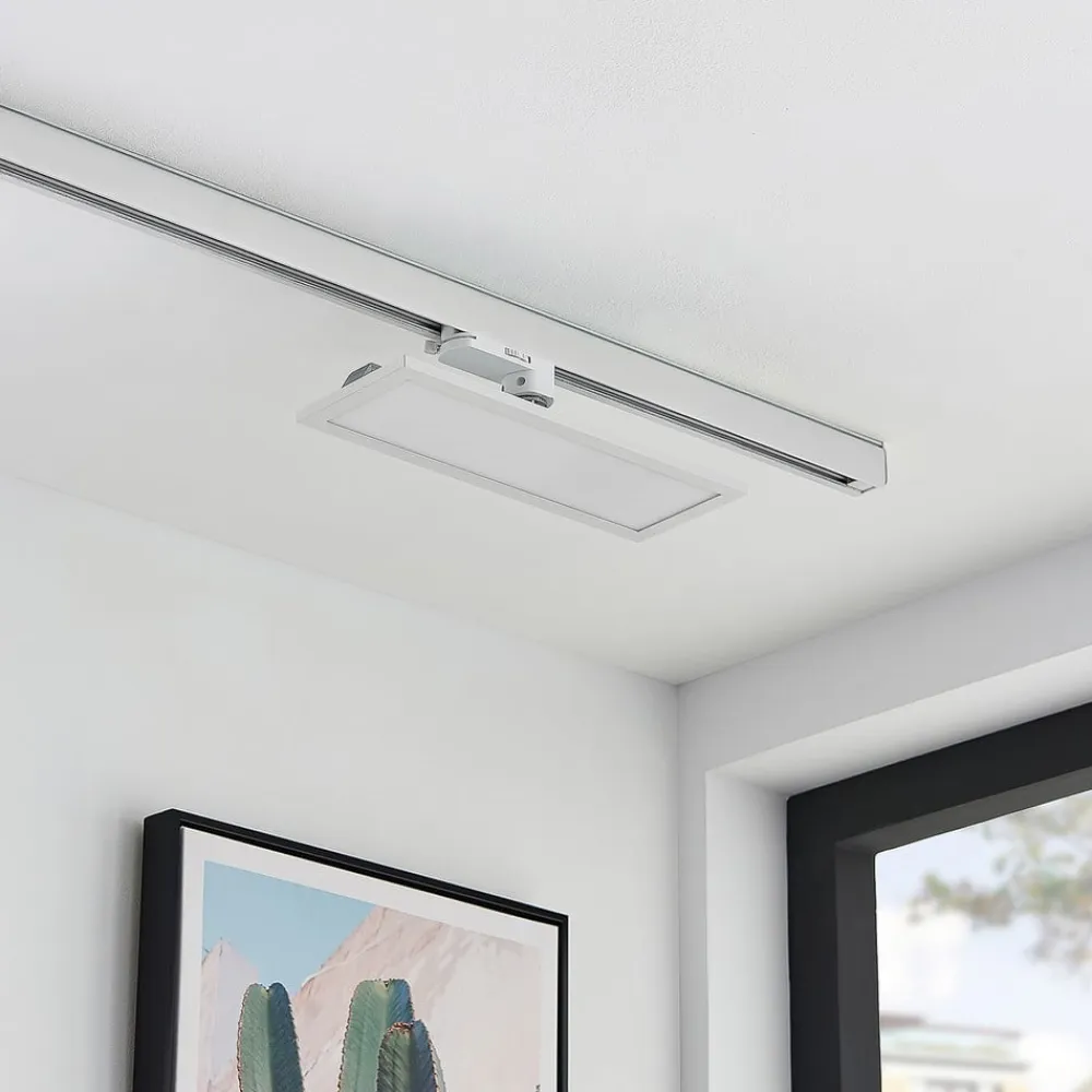 Hairis LED-panel med hvid ramme til brug på en 3-faset skinne, drejelig Dette LED-panel er en individuelt drejelig lyskilde til tilslutning på en 3-faset skinne. LED’erne er jævnt fordelt over det oplyste område og giver et stærkt lys, som kan justeres efter behov takket være panelets evne til at dreje. Sammen med andre lyskilder på skinnen kan du skabe et skræddersyet belysningskoncept, som også kan bruges i kommercielle miljøer, for eksempel i en butik – SDCM < 4 – UGR 28.9