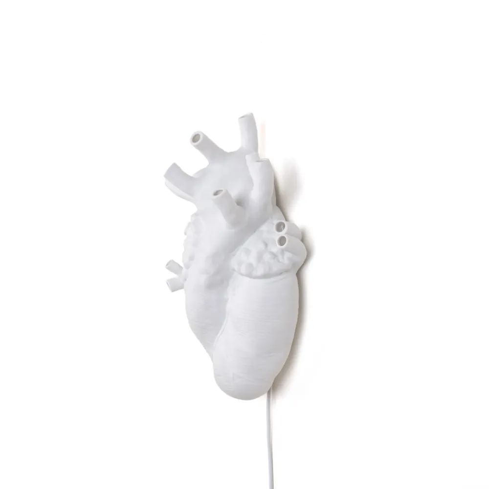 Heart Lamp – lysende blikfang i et hyperrealistisk konceptDenne LED-væglampe bliver straks et blikfang: Som navnet “Heart Lamp” allerede antyder, har den italienske designer Marcantonio designet en lyskilde i den detaljerede form af et menneskeligt hjerteorgan. Det anvendte materiale er hvidt porcelæn, som lader det varme hvide lys fra den E14 LED-lampe, der anvendes indeni, skinne blidt igennem. Stikkablet, som også rummer kontakten, giver mulighed for fleksibel betjening ved en stikkontakt.
