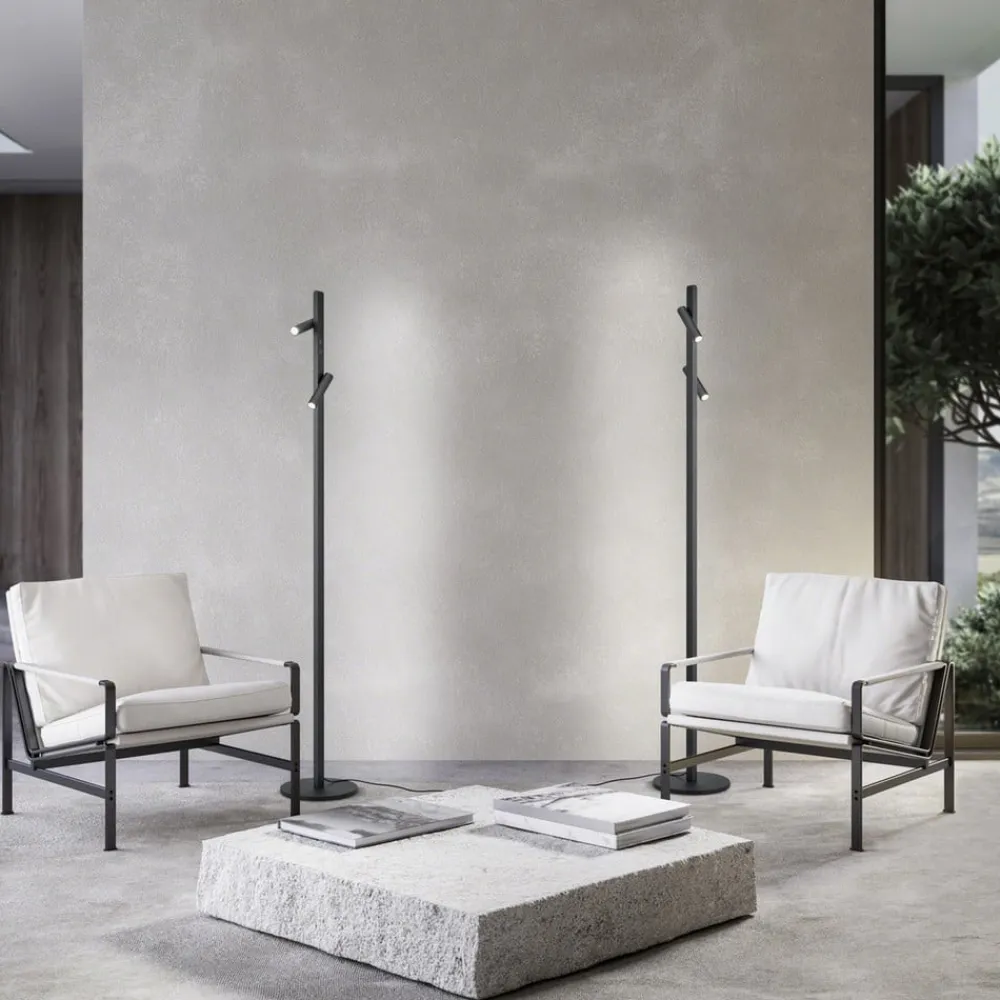 Sort Coni LED-gulvlampe med to justerbare spots og lysdæmper Med varmhvide LED’er, der også har en meget god farvegengivelse (CRI 90), giver Coni LED-gulvlampen en behagelig belysning af høj kvalitet. Da lyskilderne er placeret i seks cylindriske spots, der kan justeres, kan de tilpasses efter behov. Der er også en ekstra LED-strimmel på den ene side af kroppen, så der også kan opnås indirekte belysning via væggen. Med sin matsorte finish og klare former er Coni det ideelle valg til moderne møbleringskoncepter – Integreret trykknap til tænding og dæmpning på armaturhuset