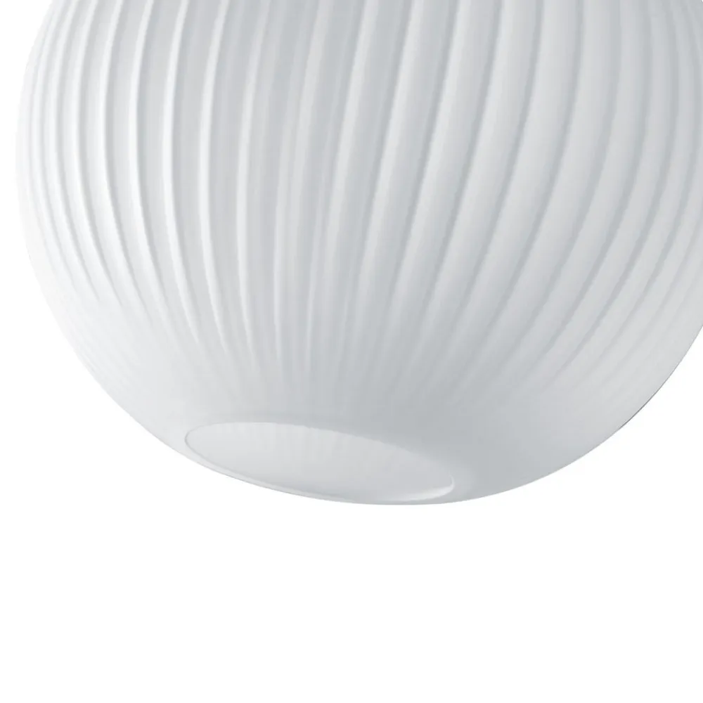 Smuk Loft pendellampe med glasskærmDen kugleformede glasskærm på Loft pendellampen giver ideel belysning i moderne opholdsrum, f.eks. over borde. Lampeskærmen er udstyret med riller og holdt i opalhvid, og den giver en vidunderlig kontrast til resten af armaturet. Baldakinen samt tekstilkablet er holdt i sort og giver dermed det moderne look.