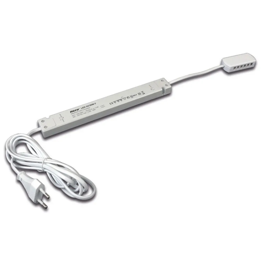 Denne transformer er egnet til at forsyne enheder med 24V indgangsspænding, der er udstyret med Hera LED 24-stik. Transformatoren, som er flad, har et stik til tilslutning til stikkontakten.