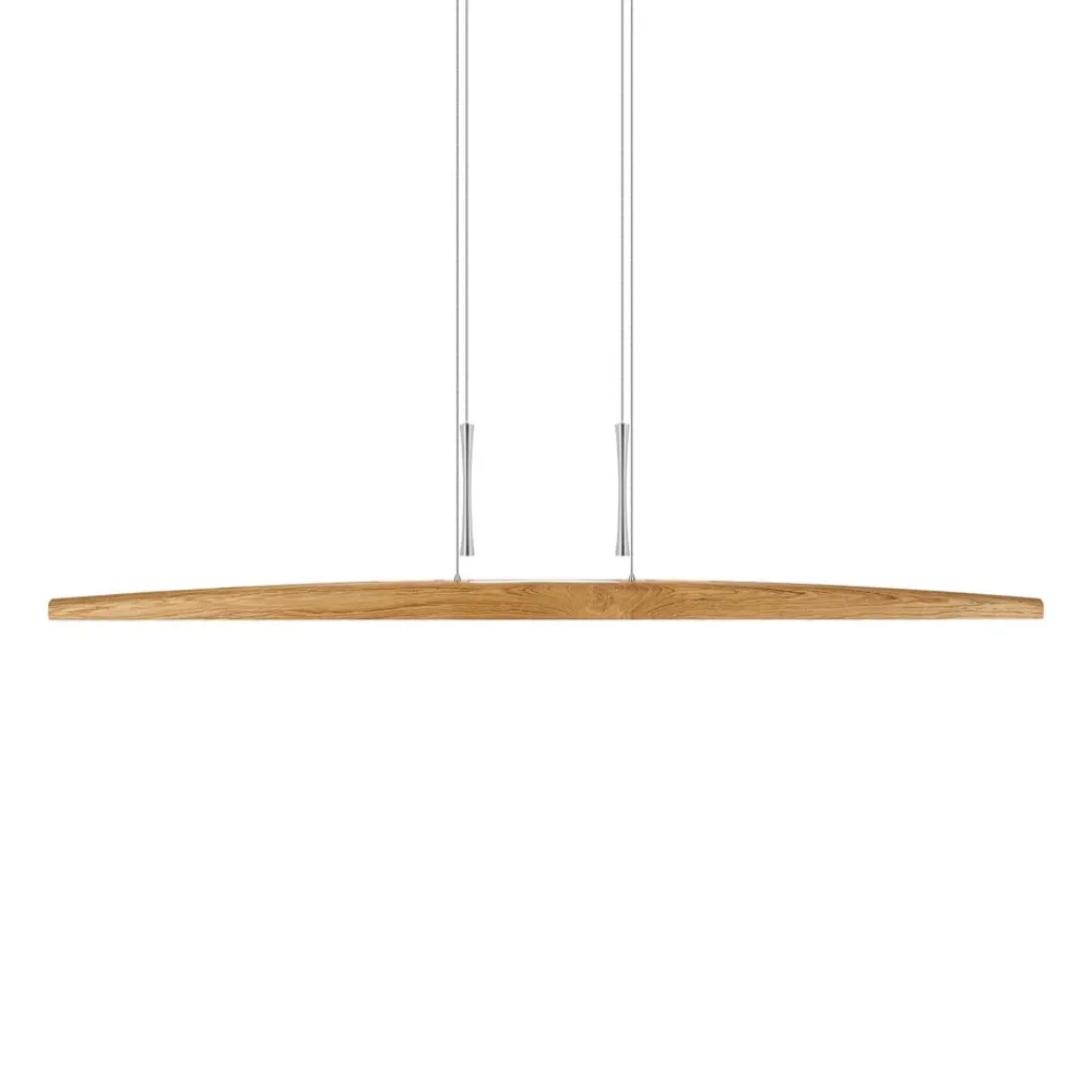 LED-pendellampe Arco med lang træbjælke og pull pendlerBjælkependellampen Arco er en dygtig kombination af naturligt træ og moderne metalelementer. Træbjælken indeholder LED’er på den øverste og nederste side, så der opnås direkte og indirekte belysning. Takket være to berøringssensorer til uplight og downlight er der mulighed for individuel regulering af lysstyrken. Ophænget med slanke kabler, der føres via afvisere i baldakinen og er udstyret med slanke, konkave modvægte, gør det muligt at justere ophængets højde.- bæredygtigt træ fra FSC-certificerede leverandører- god farvegengivelse: CRI > 90- dim-to-warm: dæmpning ændrer lysets farve – universalhvid (4.000 K) for høj lysudbytte, varm hvid (2.200 K) for lavt lysudbytte.- fremstillet i Tyskland