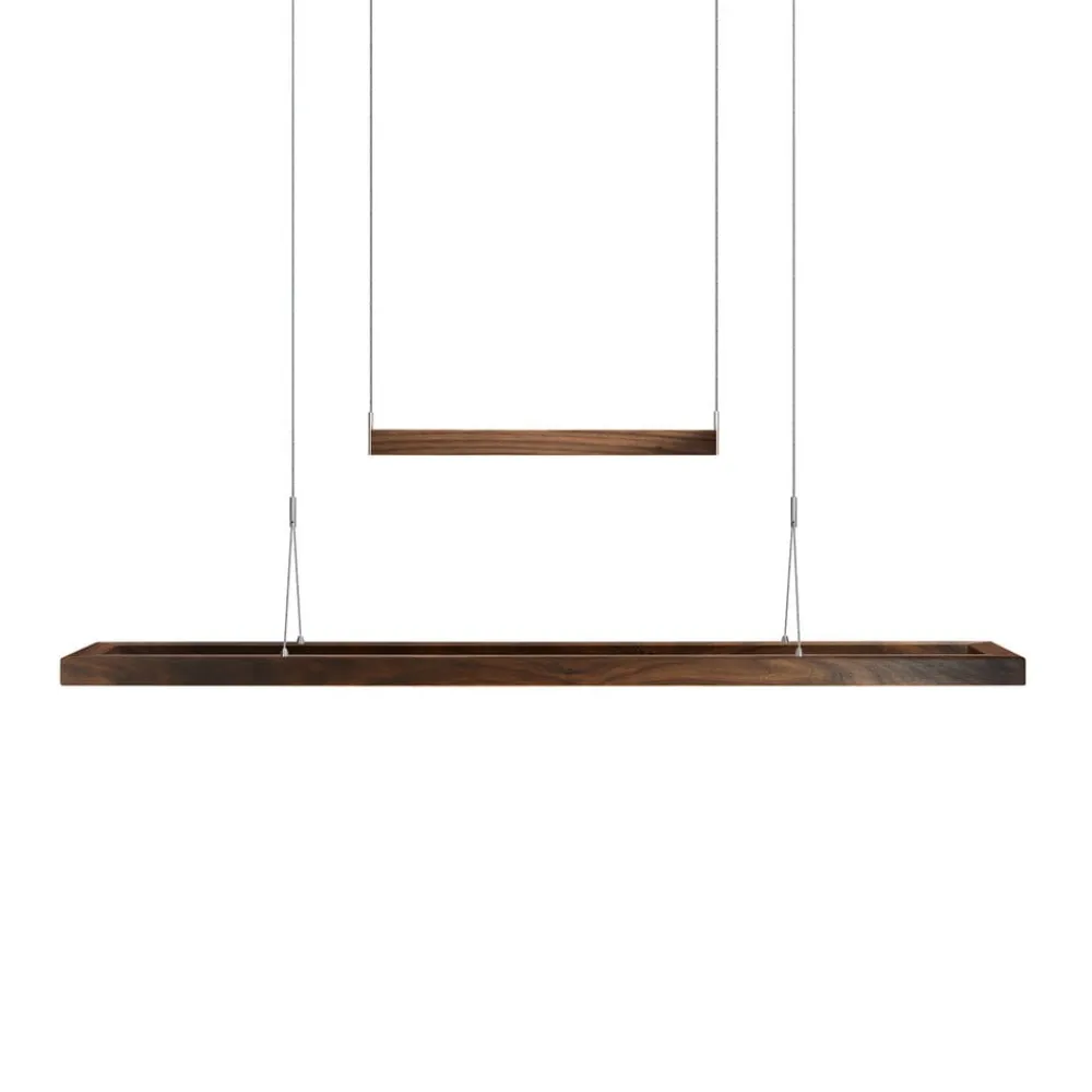 LED pendelarmatur Amalia – to træpendler, uplight og downlightEn stor, rektangulær træramme med LED’er, der stråler nedad, og en mindre træbjælke, der tjener som modvægt og rummer LED’er, der stråler opad, kendetegner LED pendelarmaturet Amalia med deres naturlige udseende. Baldakinen i mat børstet nikkel sikrer også, at Amalia kan kombineres perfekt med moderne indretningskoncepter. Ophænget med slanke kabler, modvægt og afvisere, der er skjult i baldakinen, gør det muligt at justere højden på pendlen. Separate berøringssensorer for det øverste og nederste lys giver mulighed for individuel justering af lysstyrken – bæredygtigt træ fra FSC-certificerede leverandører – god farvegengivelse: CRI > 90 – dim-to-warm: lysdæmpning ændrer lysfarven fra universalhvid (4.000 K) med høj lysudbytte til varm hvid (2.200 K) med lavt lysudbytte – fremstillet i Tyskland
