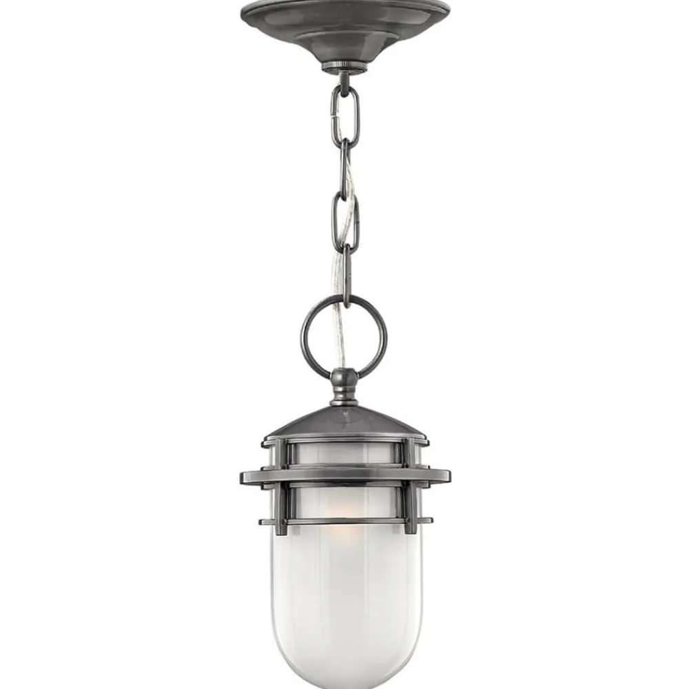 Reef pendellampe designet til det overdækkede udendørs område er umiskendeligt nautisk. Den store glasskærm lavet af ætset glas holdes på plads af stærke ringe lavet af støbt aluminium. En smuk kæde og en baldakin med maritimt design fuldender det smukke rev.