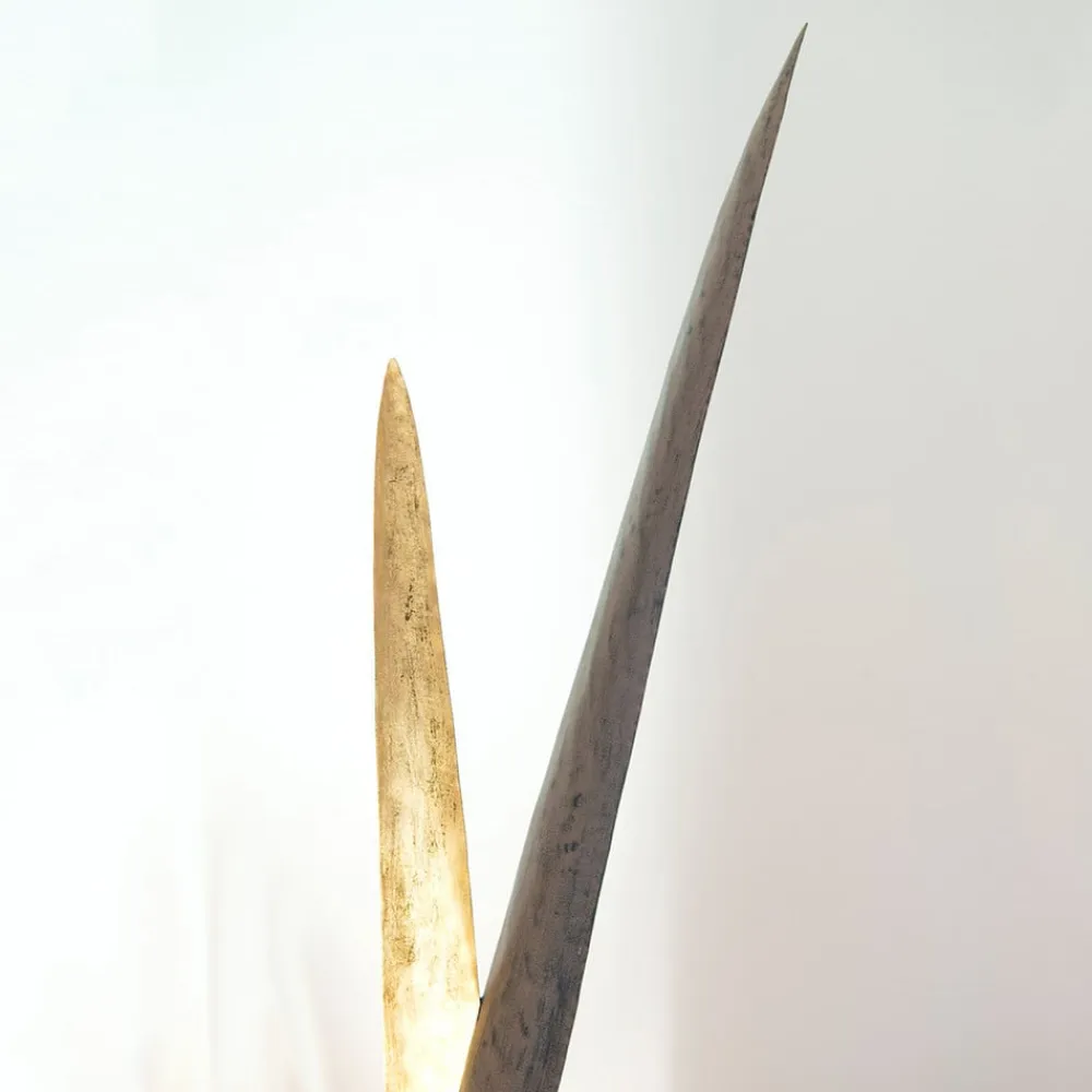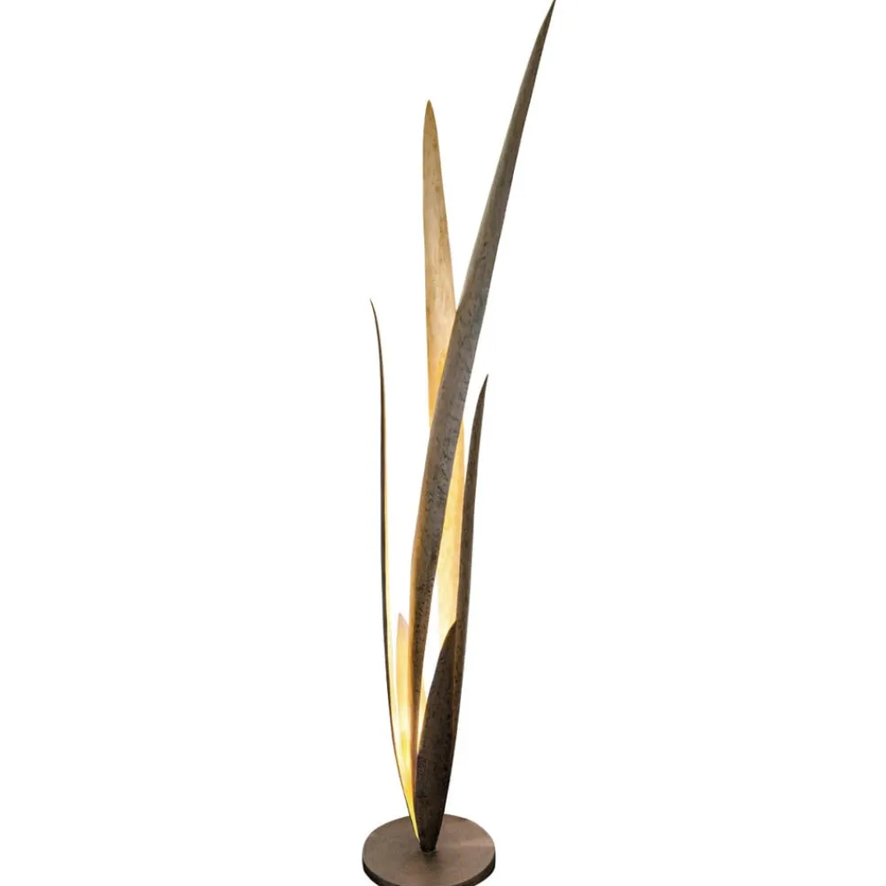 Dekorativ Palustre-gulvlampe lavet af jern Bladene på Palustre-gulvlampen, som omgiver lyskilden indeni, ligner overdimensionerede græsstrå. De har forskellige højder, er lavet i et smukt brun-sort design på ydersiden og i en varm gylden tone på indersiden og snor sig opad fra den runde base. Lyskilden (valgfri halogen- eller LED-lampe med GU10-fatning) sidder centralt mellem bladene og skinner på den gyldne inderside af dem, hvilket skaber unikke lysrefleksioner. Kontakten til praktisk betjening er indbygget i forsyningskablet.