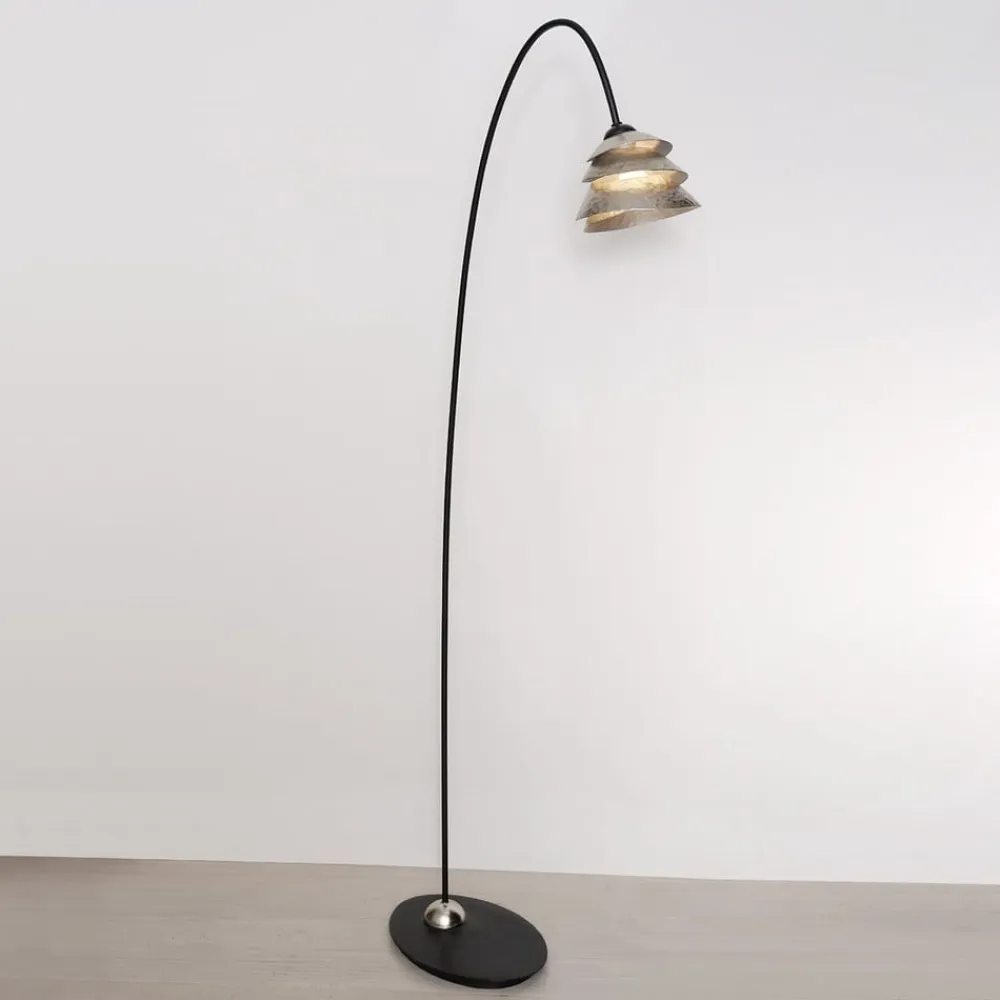 SNAIL ONE gulvlampe – en drøm af jernMed SNAIL ONE gulvlampe, der er fremstillet udelukkende af jern, kan der skabes en hyggelig atmosfære selv i små rum takket være dens smalle dimensioner. Den slanke, sorte lampefod med sølvfarvet dekoration danner en bue i den øverste tredjedel til den brune skærm, som også er lavet af jern. Skærmen består af et spiralformet jernbånd, der er lagt oven på hinanden. Lyset strømmer ud gennem de forskellige åbninger. Et særligt kvalitetstræk ved denne lampe er de filigranagtige sømme i de enkelte bladsølvplader på skærmens overflade, som kun findes i ægte bladsølvarbejde. Sømmene er på ingen måde ridser, men beviser – tværtimod – den høje kvalitet af bladsølvet i denne gulvlampe.