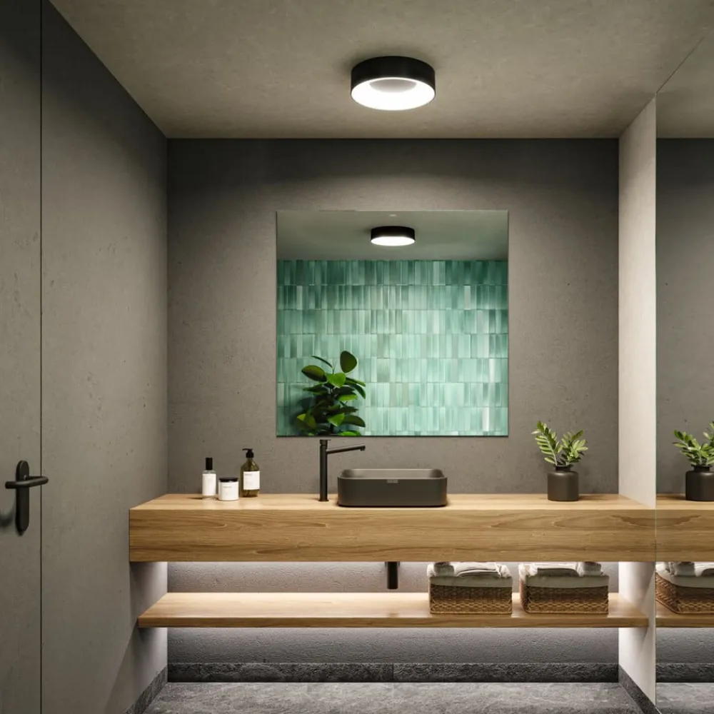 Rund LED-loftslampe Casca til badeværelset, med tre indstillinger for lysfarve Dermed kommer lyset kun ud over den indre kant og skaber et flot lysspil.