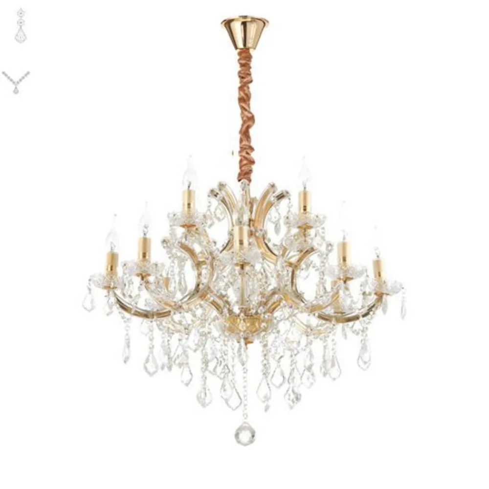 12 lyskilder Napoleon lysekrone med guldfarvet struktur Napoleon lysekronen fylder rummet med et funklende lysspektakel. Det skabes af de mange klare, slebne glas- og krystalelementer, der bryder lyset. Tolv fatninger, der er udformet som lysestager, rummer hver en pære af typen E14. Metalkroppen har en guldfinish.