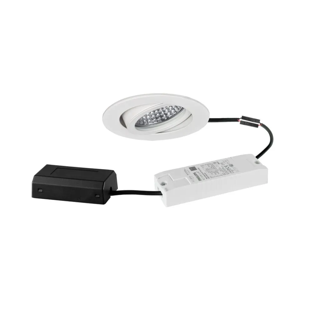 Tirrel-R indbygningsspot med DALI-dæmpbart styreapparat og tilslutningsboks Det runde Tirrel R indbygningsspot med LED leveres som sæt med et dæmpbart, elektronisk styreapparat og en tilslutningsboks. Den kan monteres i loftet uden brug af værktøj ved hjælp af installationsfjedre og kan drejes 20°, så lysstrålen kan justeres efter behov. Den sølvfarvede reflektorpære med rotationssymmetrisk bredstrålende lysfordeling og den transparente glasafskærmning sikrer optimal lysfordeling og høj lysudbytte, – Tilladt omgivelsestemperatur (ta): -20 °C – +25 °C – Beskyttelsesklasse (EN 61140): II, kapslingsgrad (DIN EN 60529): IP20 – med elektronisk forkobling, DALI-2 dæmpbar – med tilslutningsboks – uden synlig snapring