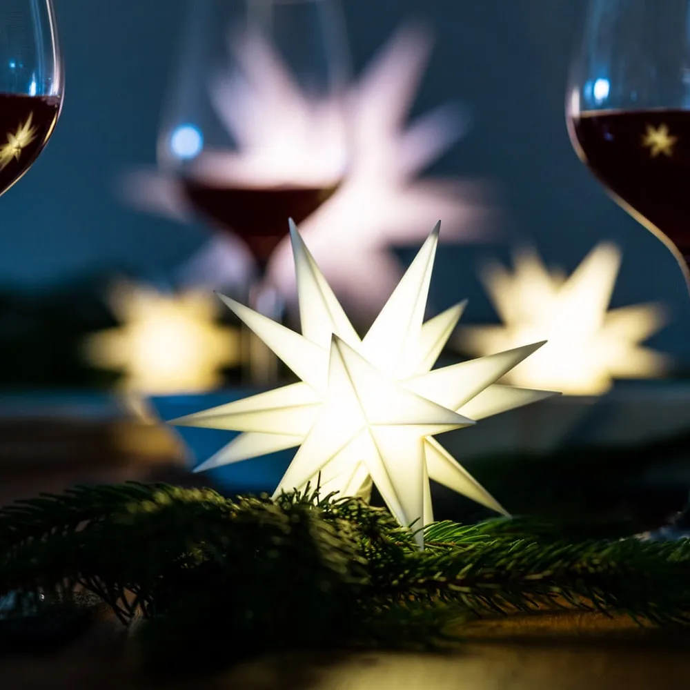 Den dekorative stjerne er belyst af LED’er, og lyset fremhæver den usædvanlige form med de mange tænder særligt smukt. Der kan sættes tre AA-batterier i det medfølgende batterirum. Egnede batterier kan fås separat via tilbehør.