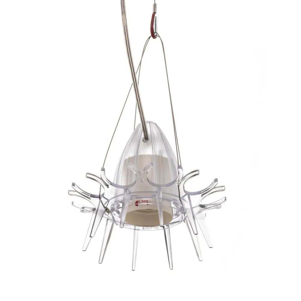 Naturligvis mangler opmærksomheden til detaljer ikke ved Campari Light Campari kapslen der sidder i midten af ophænget, giver et sjovt udtryk, men anvendes også til en trinløs højdejustering af lampen. Baldakinen er bevidst holdt transparent, så intet kan distrahere en fra lampens udseende.