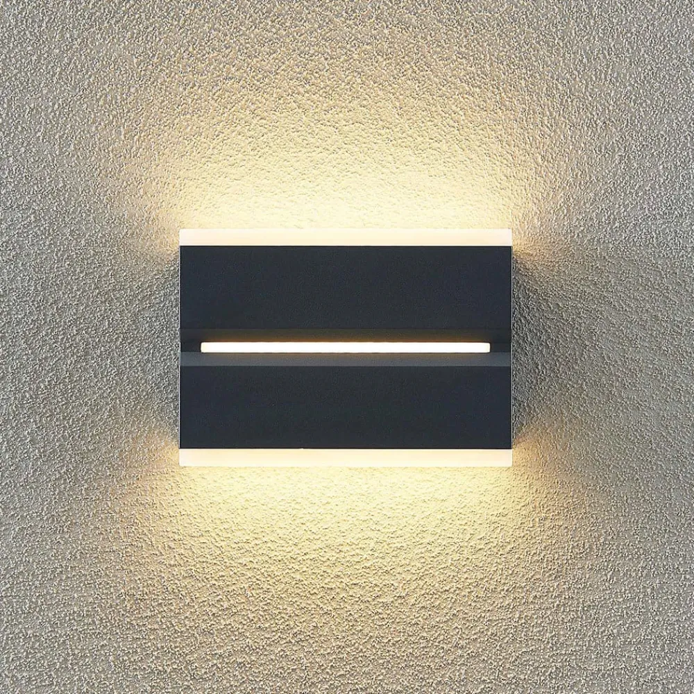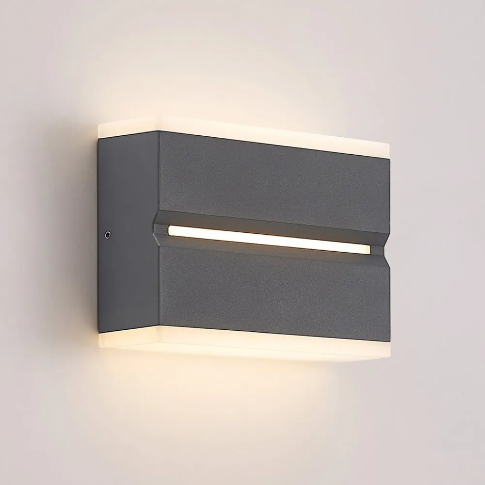 Mørk Itarion LED udendørs-væglampe med opalhvide skærme Itarion LED udendørs-væglampen har et kantet hus af trykstøbt aluminium i en trendy mørkegrå farve. Armaturet har også to skærme af opalhvid polykarbonat, som harmonerer godt med det ellers mørke design. Skærmene fungerer også som diffusorer, så lyset ikke er direkte, men blødere og mere jævnt. De varmhvide LED’er er både lyse og energibesparende, og deres bløde lys skaber en indbydende atmosfære i indgangspartiet.
