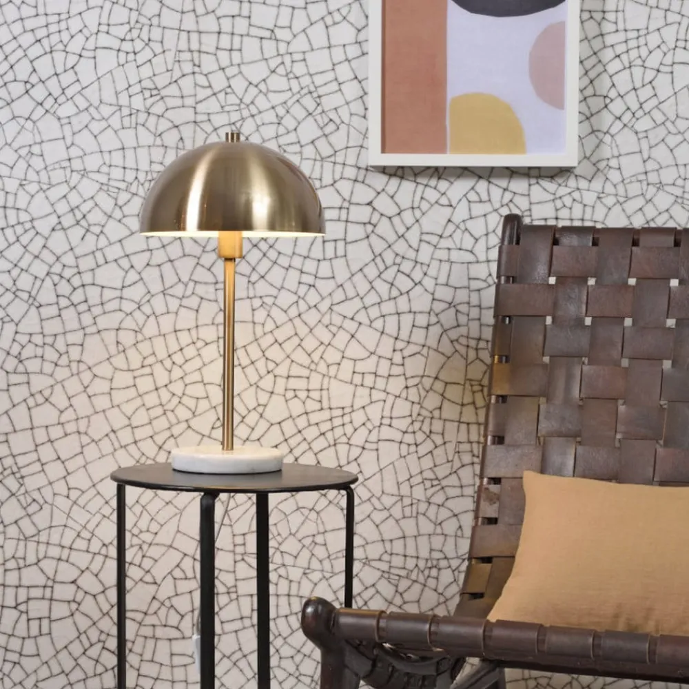 Toulouse bordlampe med marmorfod Toulouse bordlampen er lavet af jern og står på en elegant grå og hvid marmorfod. Den er helt dækket af en gylden finish og har plads til en E27-pære (medfølger ikke, se tilbehør). Der er en kontakt (tænd/sluk) på ledningen. Særlige kendetegn ved It’s about RoMi: – brug af bæredygtige materialer – der plantes et træ for hver solgt lampe – det udligner CO2-udledningen – hver lampe er inspireret af en by