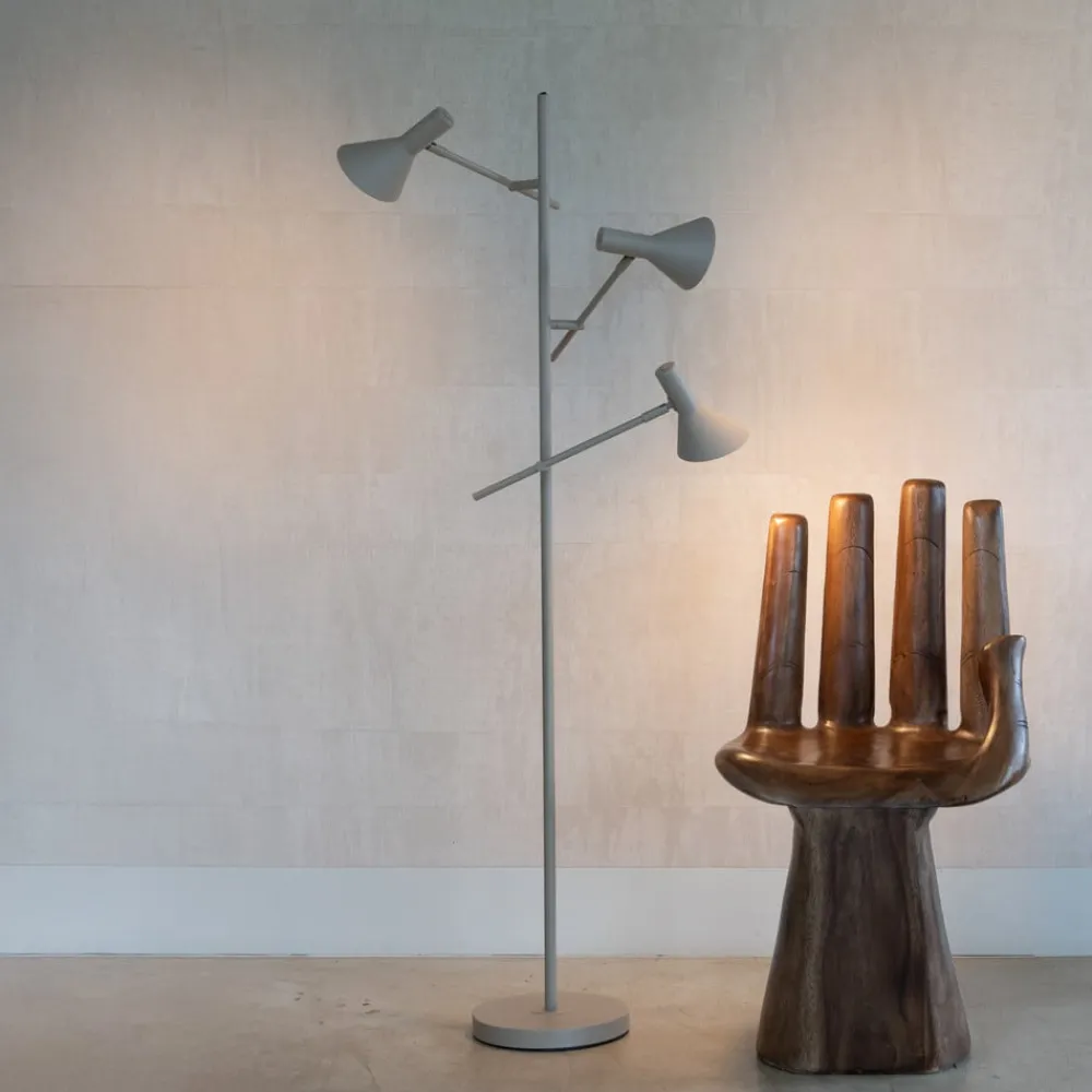 Den sandfarvede gulvlampe Izmir af robust jern overbeviser med sit klare, moderne formsprog og passer perfekt ind i moderne boligkoncepter. Med sin 3 lyskilder sikrer den en jævn og behagelig lysfordeling, der skaber en stilfuld atmosfære i både stuen og spisestuen.