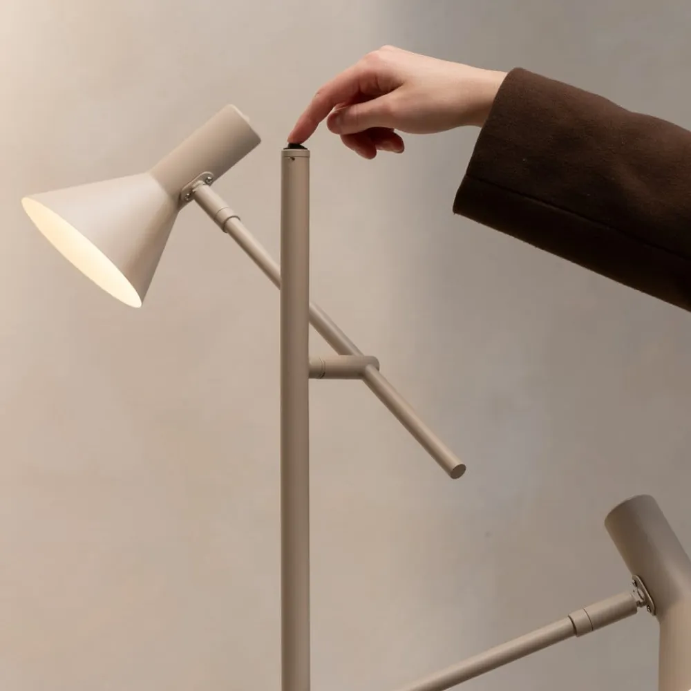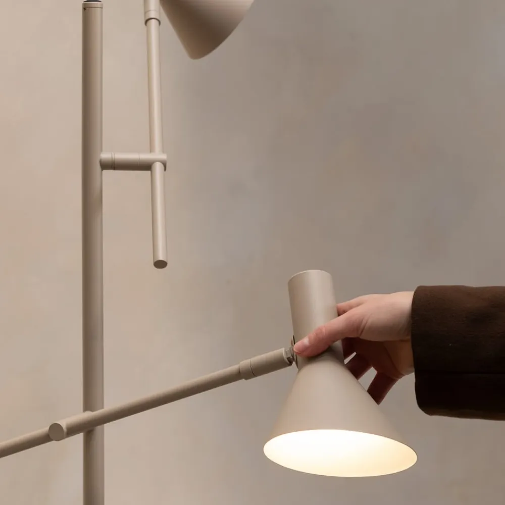 Det højkvalitative materiale og den omhyggelige forarbejdning gør gulvlampen til et holdbart og pålideligt belysningselement. Den diskrete farve i sand harmonerer med de mest forskelligartede indretningsstilarter og understreger designets tidløse elegance.