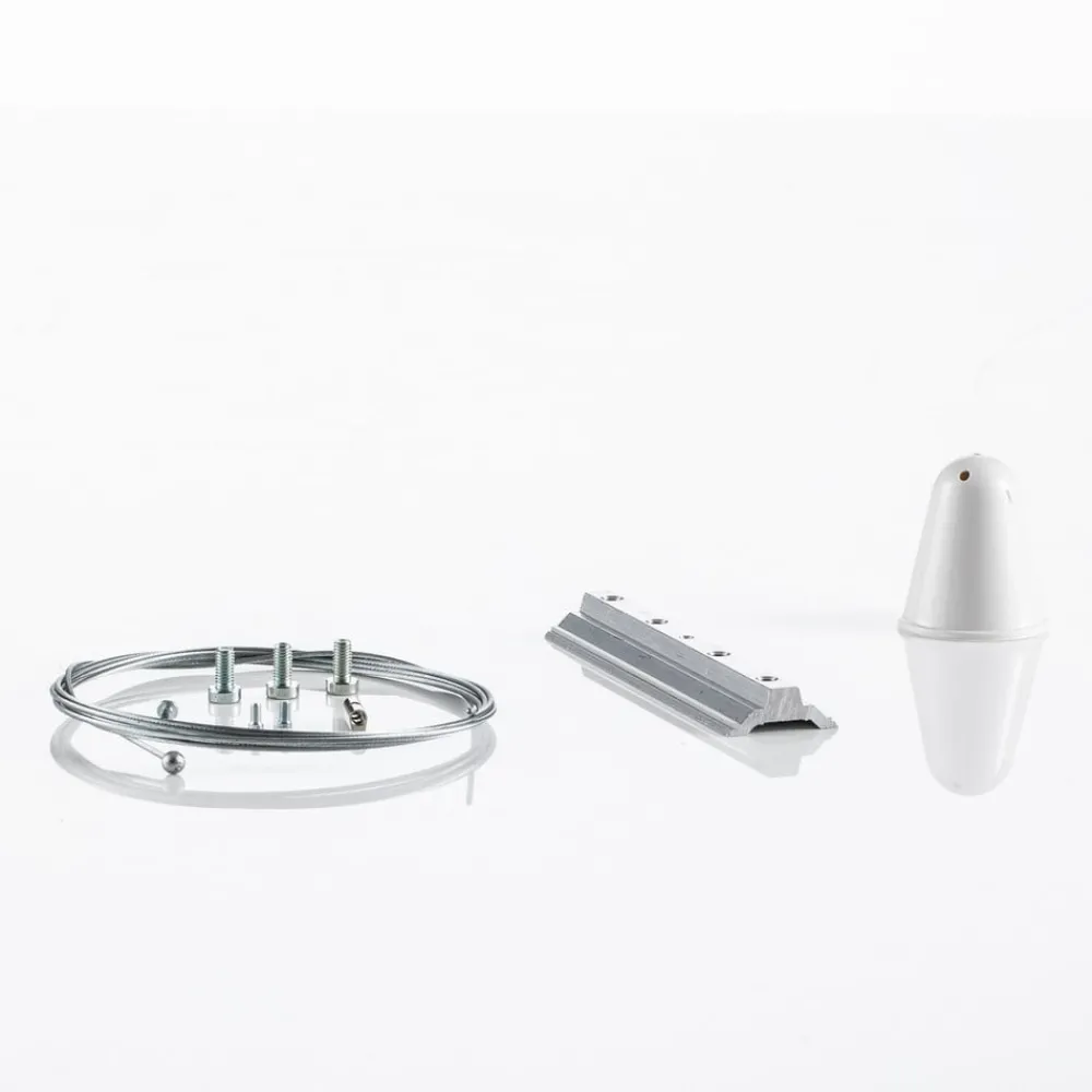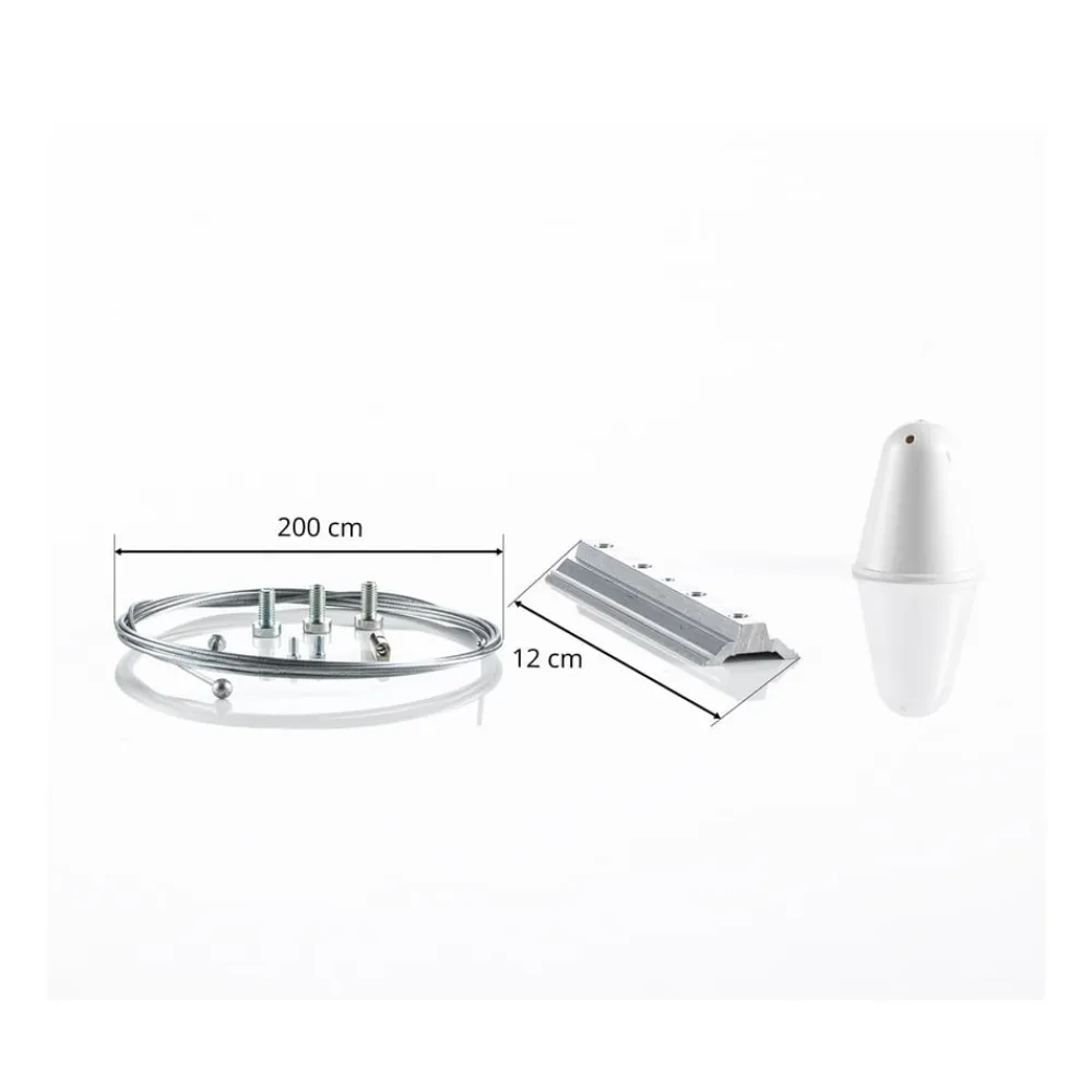 Dette ophængssæt med 200 cm stålreb, baldakin og 12 cm lang forbindelsesplade gør det muligt at ophænge Ivela LKM 3-fase skinner.