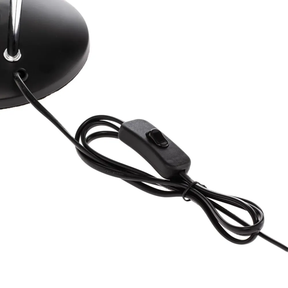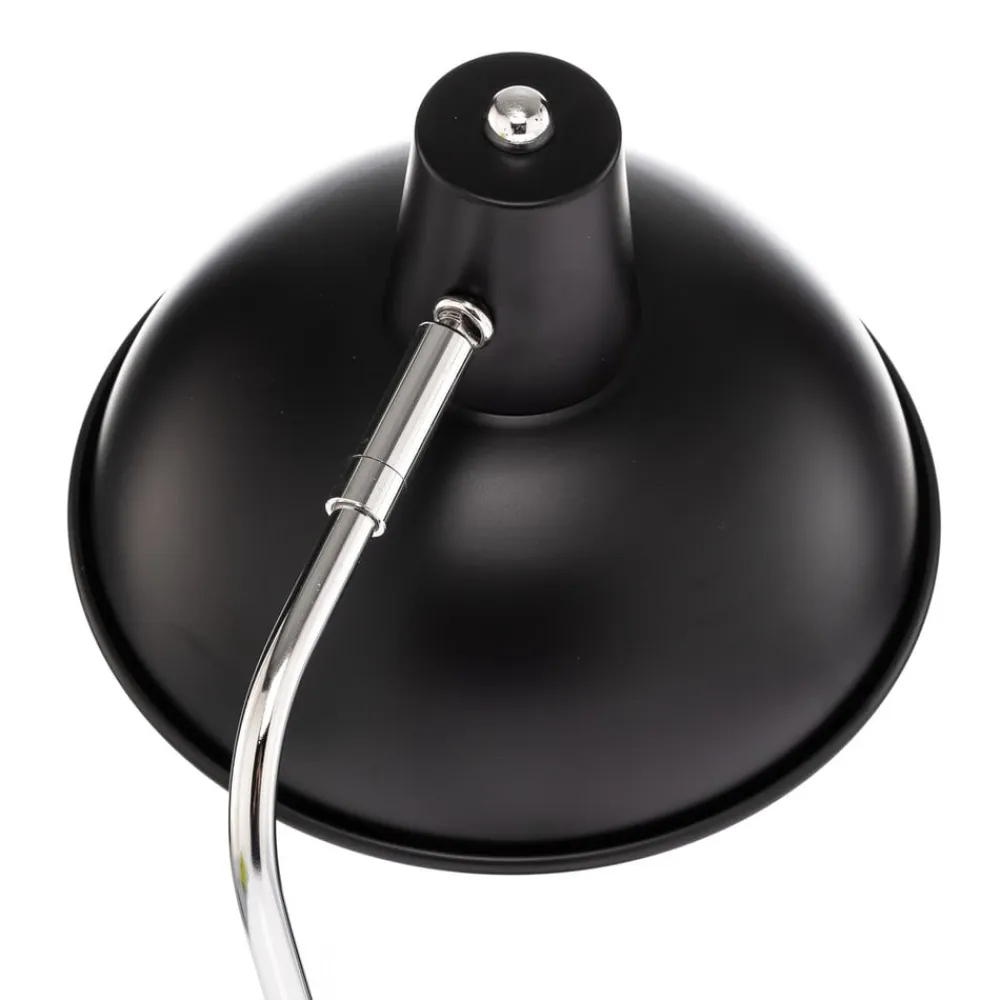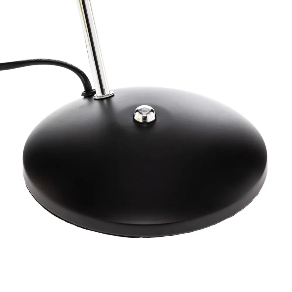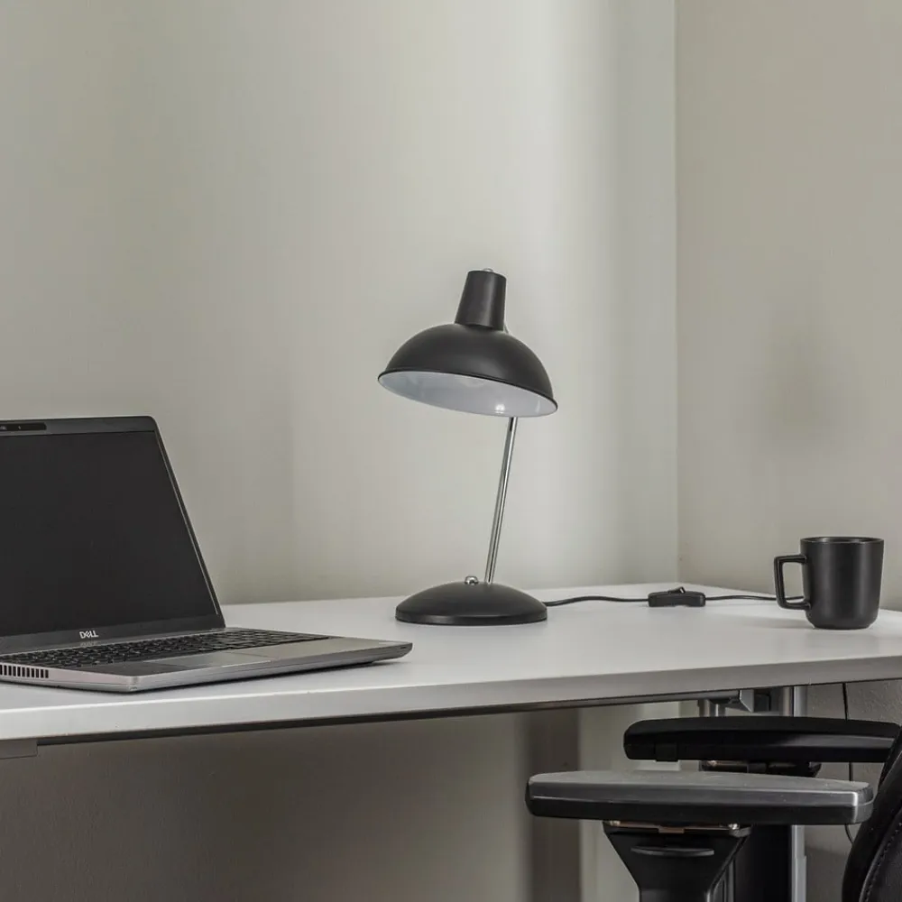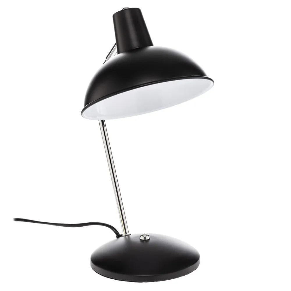 Sort Jamelia skrivebordslampe med vintagekarakter Alle komponenter i Jamelia bordlampen, som for det meste er matsort, er lavet af stål, og lyset skinner nedad, hvor det er fokuseret på en sådan måde, at lyset er ideelt til læsning. Lampeskærmen kan justeres via et led, så lyset skinner præcis, hvor der er brug for det. Generelt er skrivebordslampen ideel til læsning, og i modsætning til basen og skærmen, som er sorte, er stangen i midtersektionen i skinnende krom. Lampen kan betjenes via en kontakt på foden, og den flade, runde metalskærm har en særlig vintage-karakter og minder om lyskilder fra midten af forrige århundrede, så Jamelia kan uden tvivl kategoriseres som en vintage-lampe.