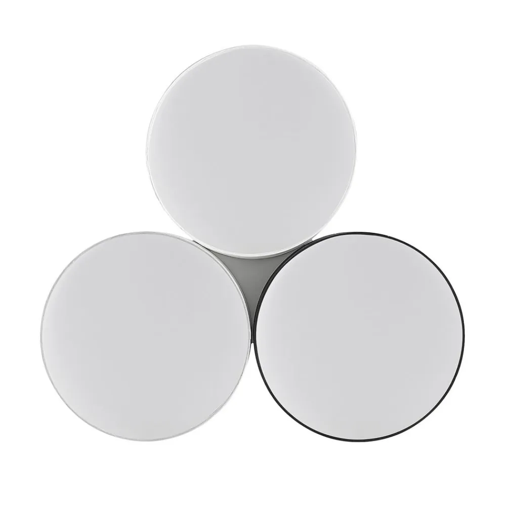 Janita trefarvet tekstilloftlampe med tre runde skærme i samme størrelse Janita har et subtilt farveskema, men hver skærm har en anden farve. Den ene er hvid, den anden er sort, og den sidste er grå. På undersiden af alle tekstilskærmene sidder en hvid diffuser, som lader LED-loftlampens lys trænge blødt og jævnt ind i omgivelserne. Alene dette gør belysningen særlig hyggelig, men muligheden for at dæmpe armaturet i tre trin giver endnu flere muligheder for individuelt lysdesign. Den almindelige kontakt på væggen er tilstrækkelig til dette. LED’erne lyser ikke kun klart, de har også et relativt lavt strømforbrug og er derfor særligt effektive med hensyn til forbrug. En vægkontakt gør det muligt at tænde og slukke lyset som sædvanligt. Takket være 3-trins dæmpningsteknologien med integreret slukfunktion kan den også dæmmes til tre forskellige lysstyrker ved at trykke på kontakten flere gange: 100 %, 50 % og 25 %.