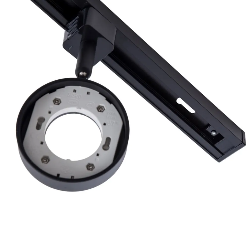Sort skinnesystem Jardani med bevægelige spotlights Jardani er et moderne skinnesystem og er lavet af aluminium. Det har en sort overflade og består af tre spotlights og en skinne. Spotlightene kan udstyres med GX53-lyskilder og giver mulighed for frit valg af lysfarve – perfekt tilpasset personlige behov. Desuden kan spottene drejes 350° og vippes 90°, så lysstrålen kan rettes efter behov. Jardani er ideel til belysning af kommercielle områder.