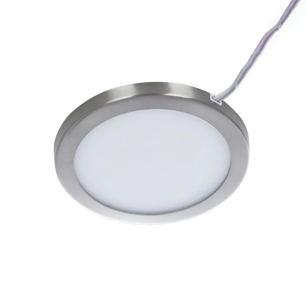 Rundt LED-underskabslampe Jopos i et sæt af tre, dæmpbarDette sæt af underskabslamper giver praktiske tjenester i stuen og køkkenet. De enkelte lamper er runde og sat ind i en ramme med satin-nikkelfinish. De kan ikke bare tændes og slukkes, men også dæmpes i tre trin (15% – 50% – 100%).