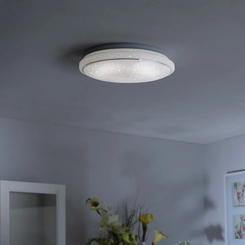 Denne store LED-loftlampe Jupiter, er fremstillet i materialerne stål og plast, og har en diameter på 60 cm. Den satinerede skærm er forarbejdet med en masse små, lysgennemtrængelige prikker, som lyset stråler uhindret igennem og dermed får hele skærmen til at virke som en enestående stjernehimmel. Et andet højdepunkt ved Jupiter LED-loftlampen er, at i modsætning til mange andre LED-lamper, behøver man ikke at vælge en lysfarve på forhånd. CCT-teknologien gør det muligt, at vælge mellem lysfarverne varmhvid (3.000 K), universal hvid (4.000 K) og dagslys (5.000 K), afhængigt af behovet – og dette ganske komfortabelt via den medfølgende fjernbetjening. Med denne kan man ikke kun vælge den ønskede lysfarve, men enhver af de valgte lysfarver kan desuden dæmpes trinløst.
