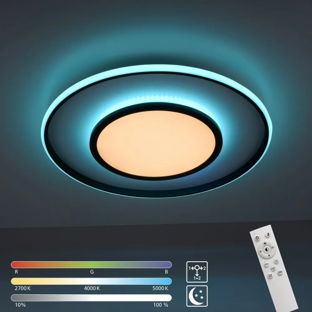 Arenda LED-loftlampen er en moderne og innovativ lyskilde med mange indstillingsmuligheder. Den består af to lysringe i forskellige størrelser og en sort ringramme, der giver et fantastisk udseende. Lyset produceres af LED’er, der kan skiftes uafhængigt af hinanden, hvilket giver mulighed for både direkte og indirekte belysning. Med den medfølgende IR-fjernbetjening kan de forskellige lyskilder skiftes, dæmpes eller ændres i lysfarve eller -temperatur. Ud over disse indstillingsmuligheder har armaturet også en hukommelsesfunktion.