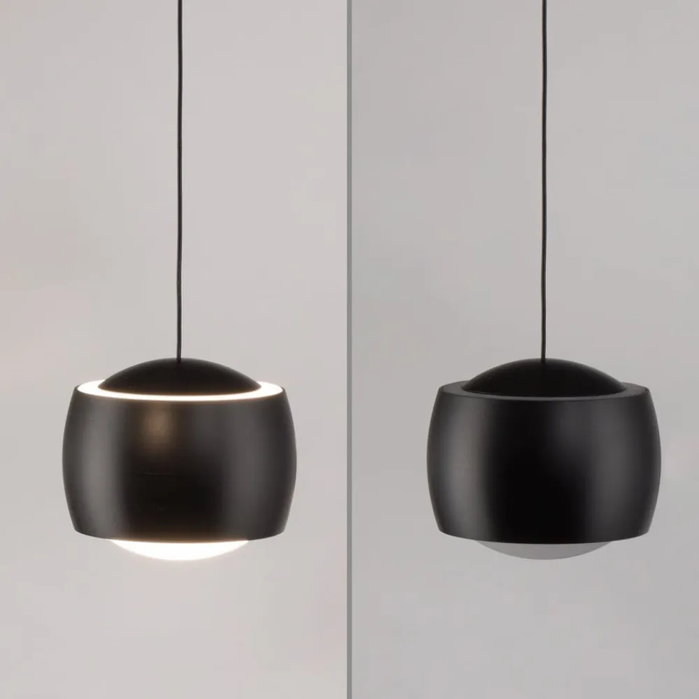 Den sorte LED-hængelampe Ballini med 1 lyskilde er udstyret med en kugle i den ringformede lampeskærm, som er uigennemsigtig i sort i den øverste del, mens lyset stråler homogent nedad gennem det opalhvide materiale. En lille del af lyset stråler desuden opad gennem den smalle ringformede lysudgang.
