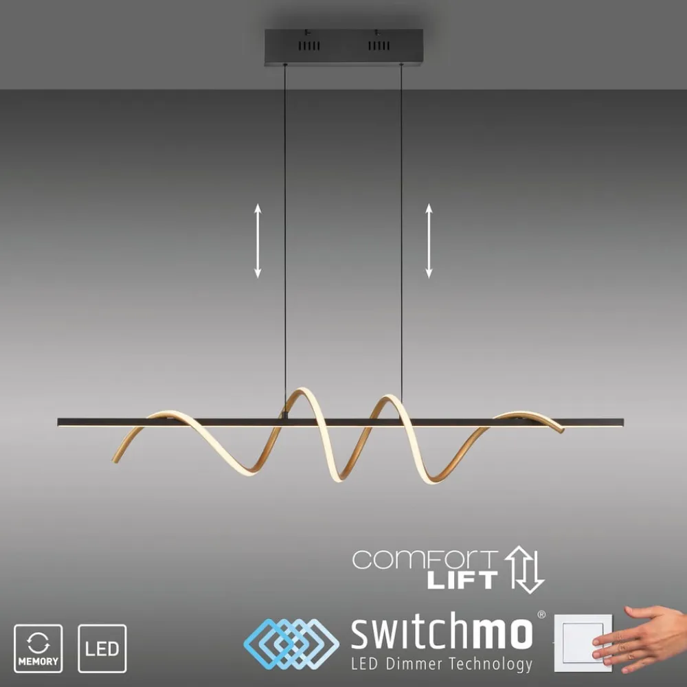 Emanda LED-pendel, sort og messingfarvet Emanda er en hængelampe i metal, som også ser meget dekorativ ud, når den er slukket, og som er særlig flot over et langt spisebord. Lampen består af en rektangulær baldakin, en lang sort metalstang, der er ophængt i den, og en messingfarvet metalspiral, der snor sig om den sorte stang. Både den lige stang og spiralen er udstyret med et satineret dæksel på den ene side, bag hvilket der er installeret varmhvide LED’er. De lyser homogent uden synlige lyspunkter og skaber et bånd eller en spiral af lys. Unge og dynamiske værdier kendetegner JUST LIGHT-mærket. – tidligere kendt som Leuchten Direkt