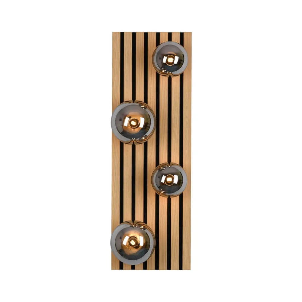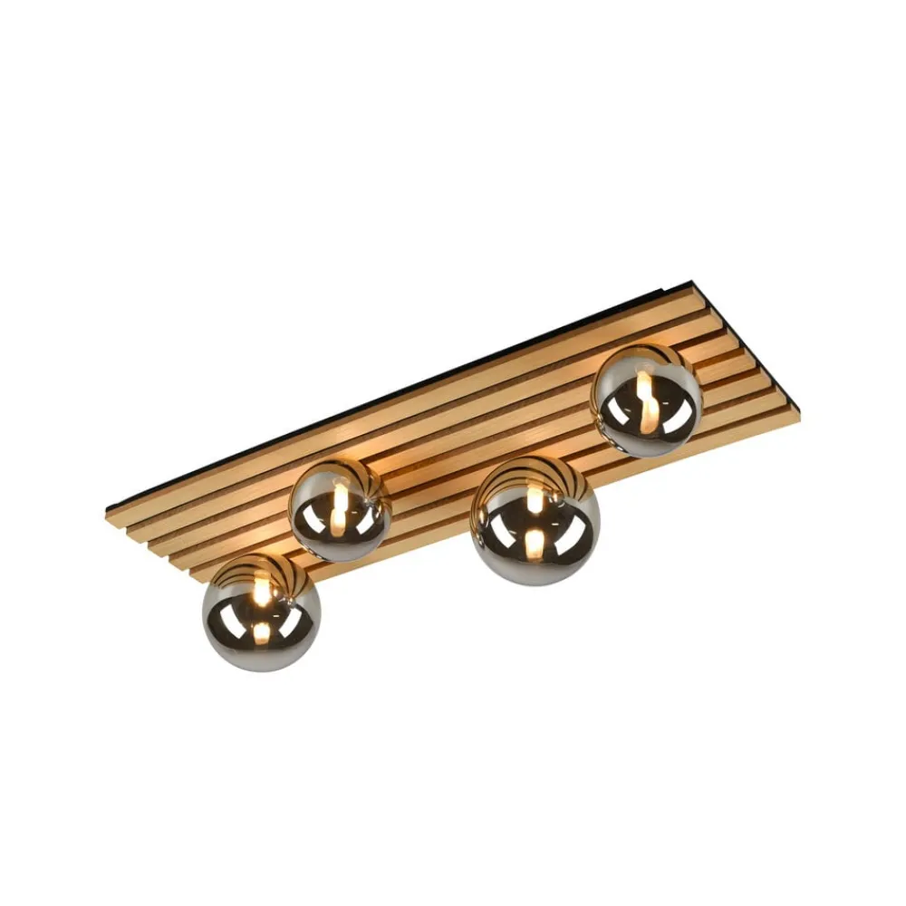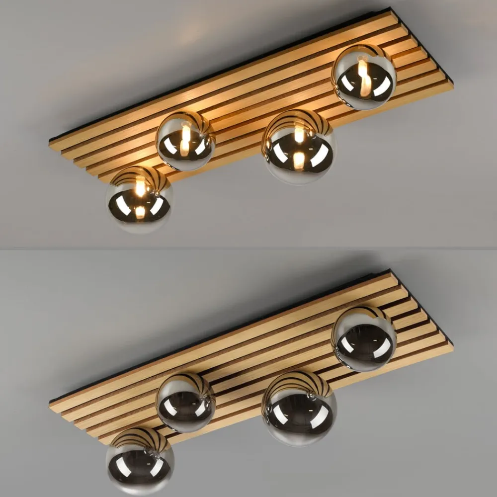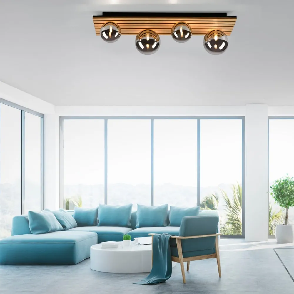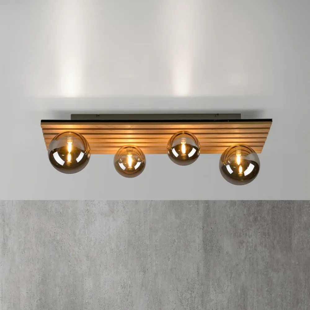 Rektangulær Green Stika loftlampe med træbeklædning og sfæriske skærme Green Stika er en rektangulær loftlampe udstyret med individuelle lange træstivere. Fire sfæriske skærme af røggråt tonet glas – to store og to mindre – er fordelt langs den lange baldakin af træ, så pærerne indeni (G9 max 5 W – medfølger ikke) kan afgive en varm og meget behagelig belysning. Armaturerne i Green-serien har et særligt fokus på brugen af bæredygtige eller genbrugte og genanvendelige materialer for at minimere CO2-fodaftrykket. Unge og dynamiske værdier kendetegner JUST LIGHT-mærket. – tidligere kendt som Leuchten Direkt