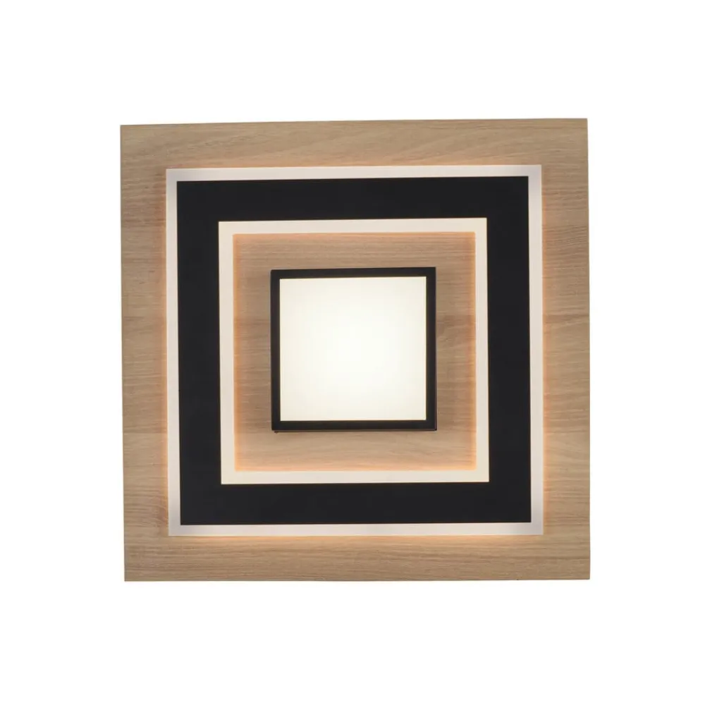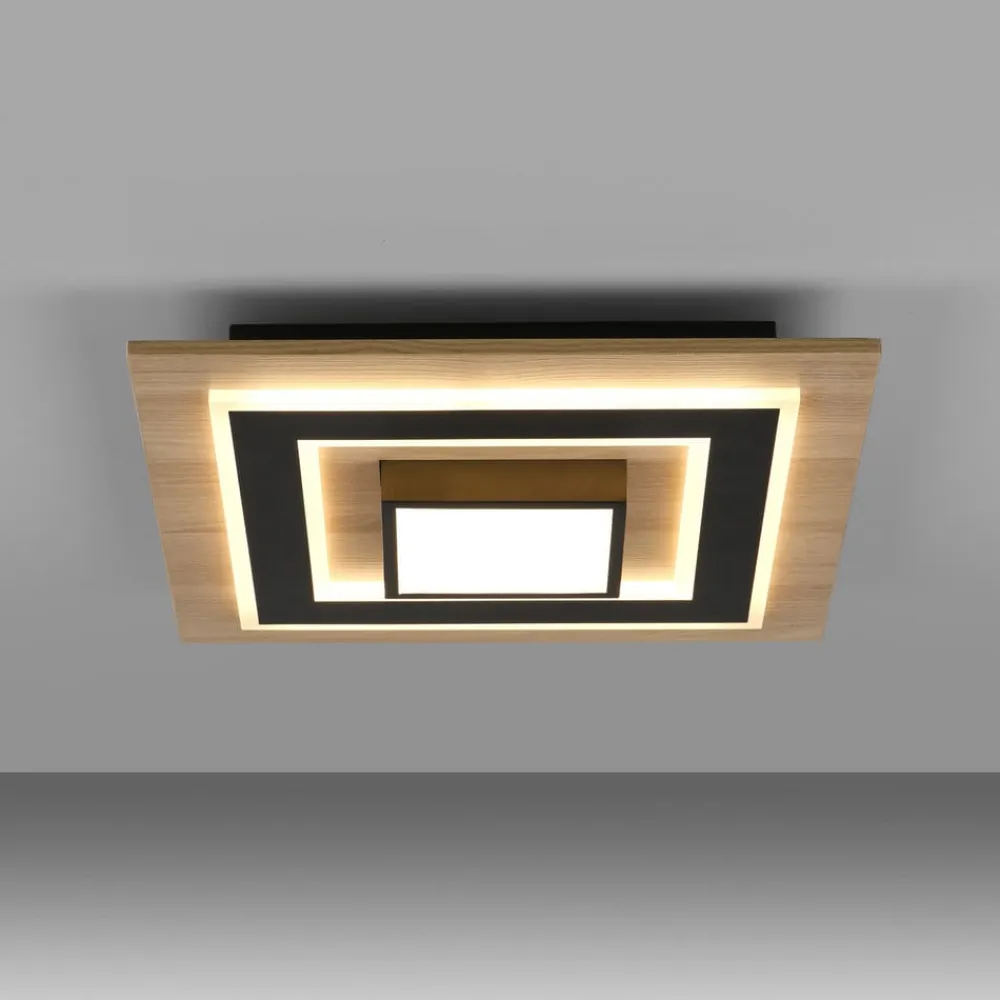 Firkantet loftlampe Tola med to lyselementer Tola er en loftlampe i en smuk kombination af træ og sort metal, der udsender varmhvidt lys og giver fleksibel belysning. Lyskontakten kan bruges til at tænde lyselementet i midten og de lysdioder, der er installeret i kanterne af den sorte ramme bag satinskærme, hver for sig eller sammen, så lysstyrken på de varmhvide lysdioder kan justeres efter behov.