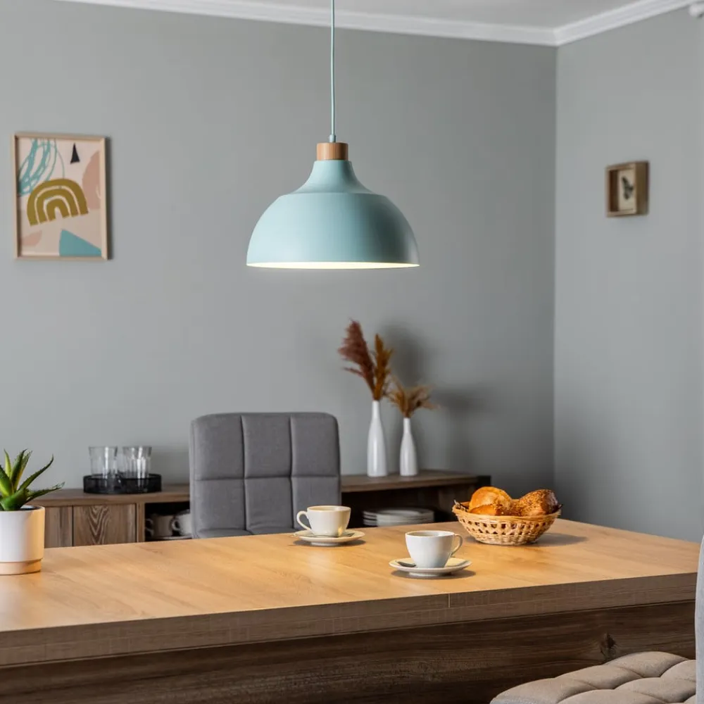 1-lysskilte pendellampe Kaitt med rund stålskærm i mintgrøn og lyse trædetaljer