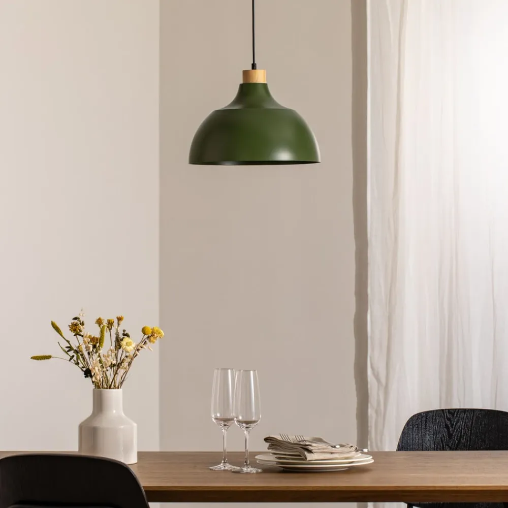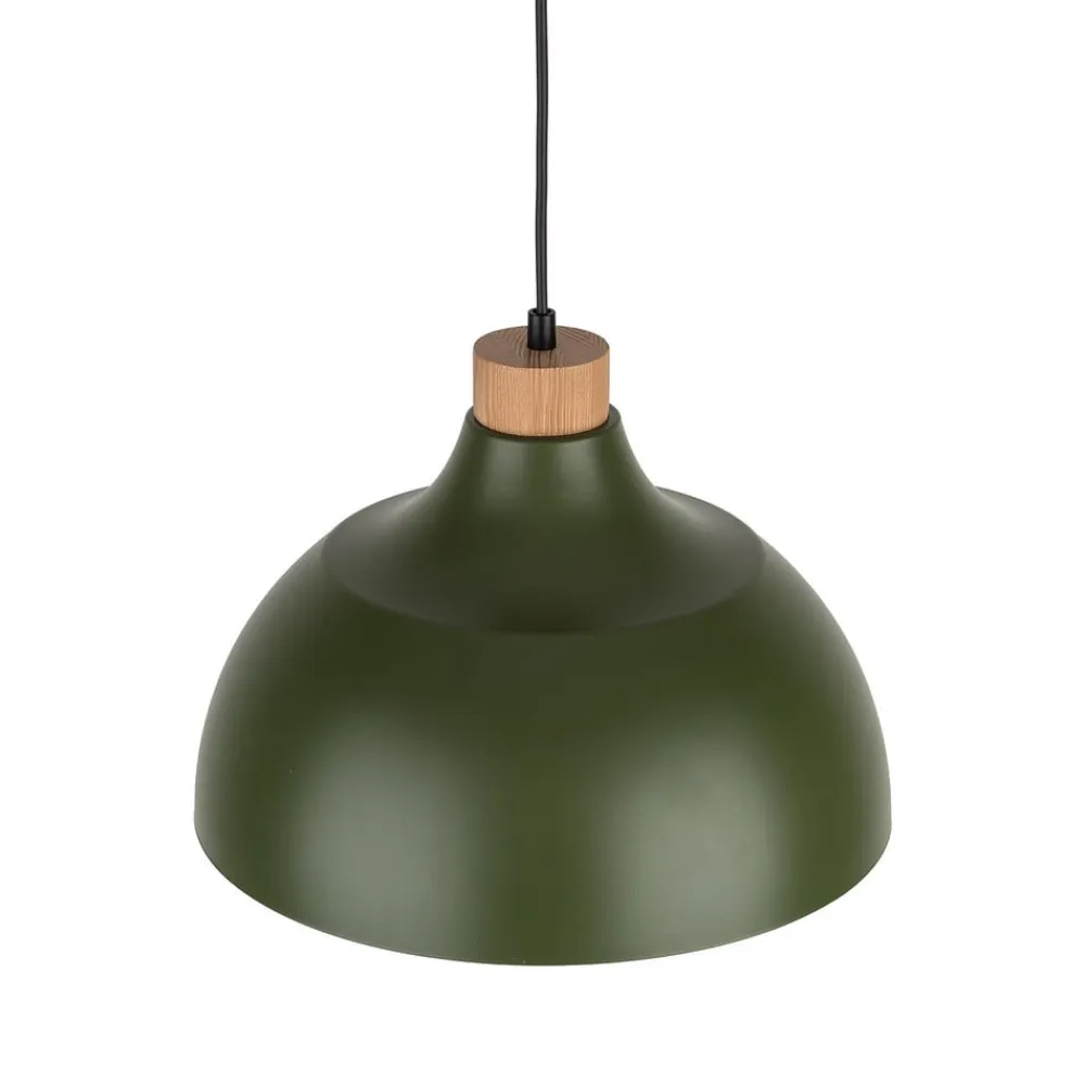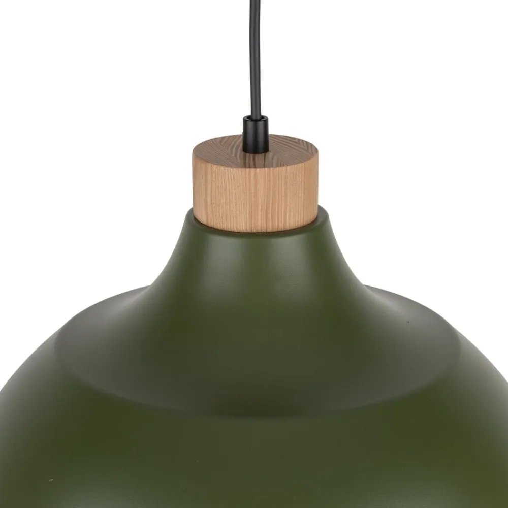 1 lyskilde pendellampe Kaitt med rund stålskærm i grøn og lyse trædetaljer