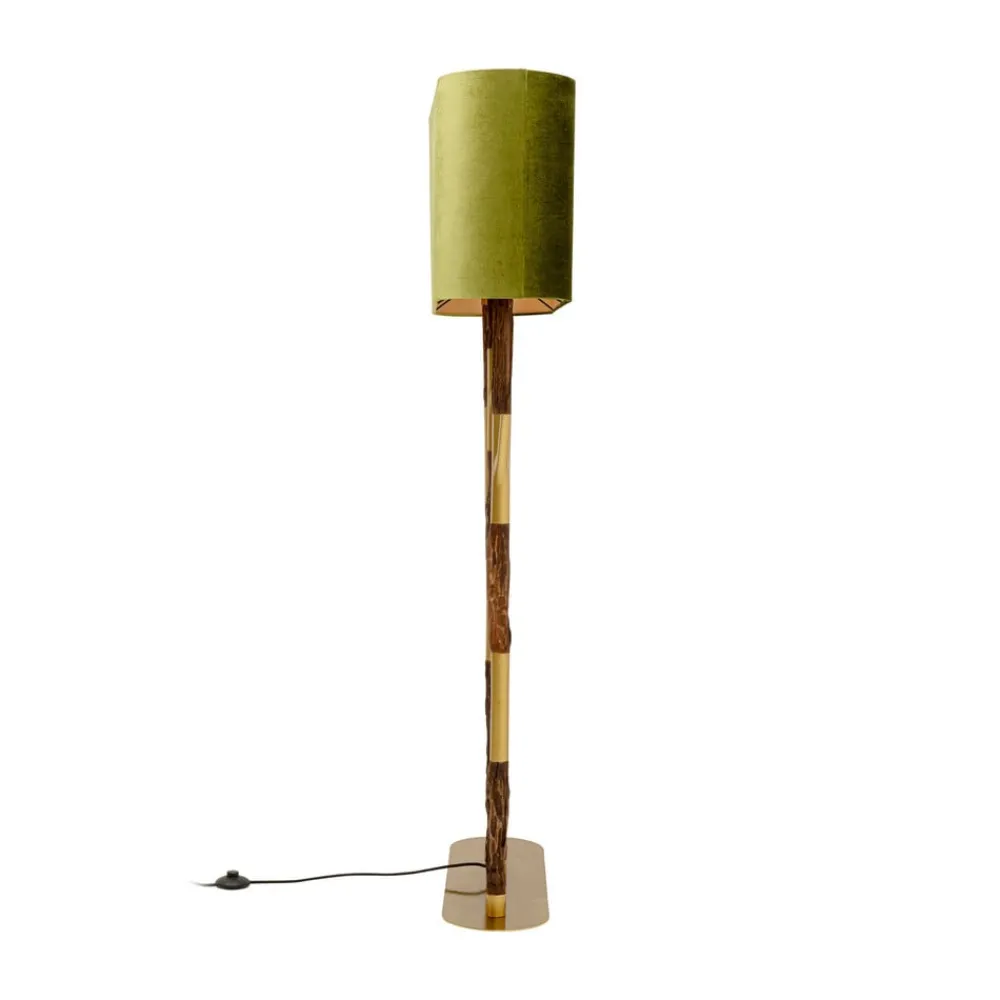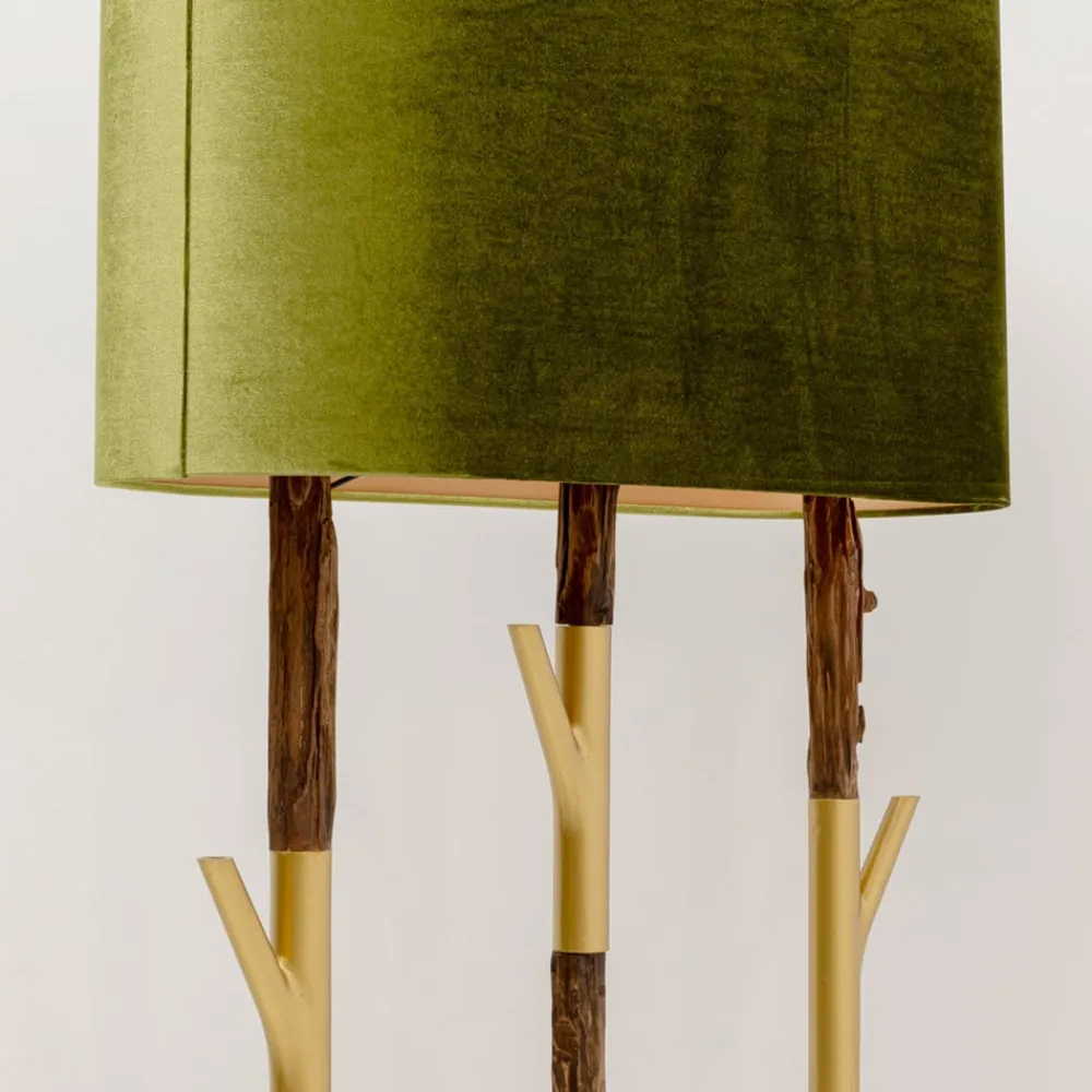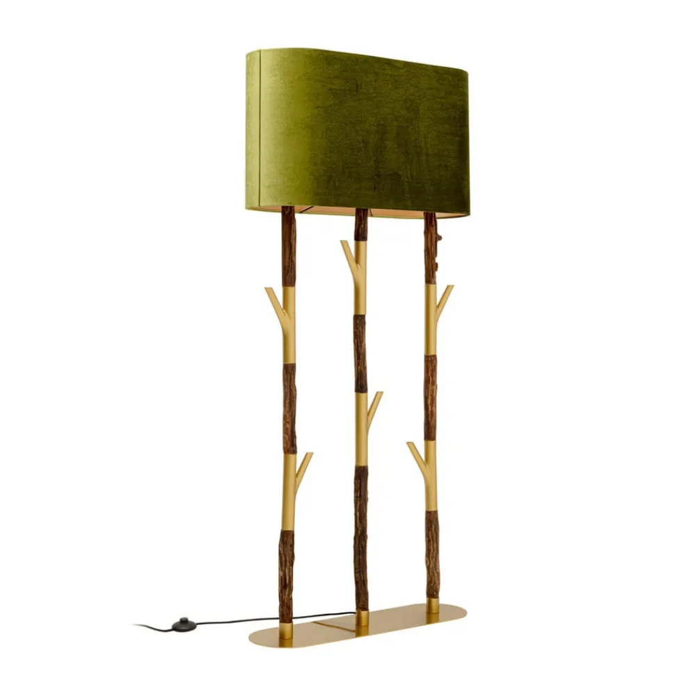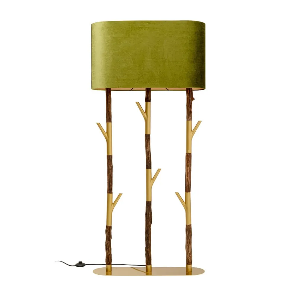 Gulvlampen Twig forener en harmonisk kombination af bomuld, træ og stål. Med sin elegante farve i grøn, guld og træ passer den perfekt ind i designorienterede boligkoncepter. Lampen sætter målrettede accenter og skaber en behagelig lysstemning, der både imponerer i stuen og i spisestuen.
