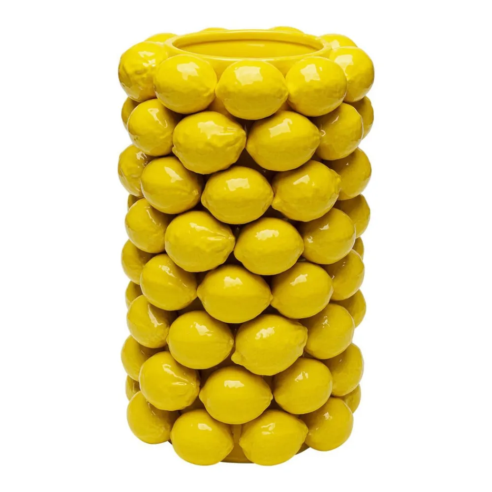 Lemon Juice-vase i cylinderform med citroner hele vejen rundt Denne Lemon Juice-vase i porcelæn er vores opskrift på en grå og ensartet bolig. Den gule farve er en rigtig humørspreder og giver et frisk pust og et dekorativt farvestænk til ethvert rum. Vasen er håndlavet af porcelæn og glaseret, hvilket gør den nem at rengøre. Hver vase er unik.