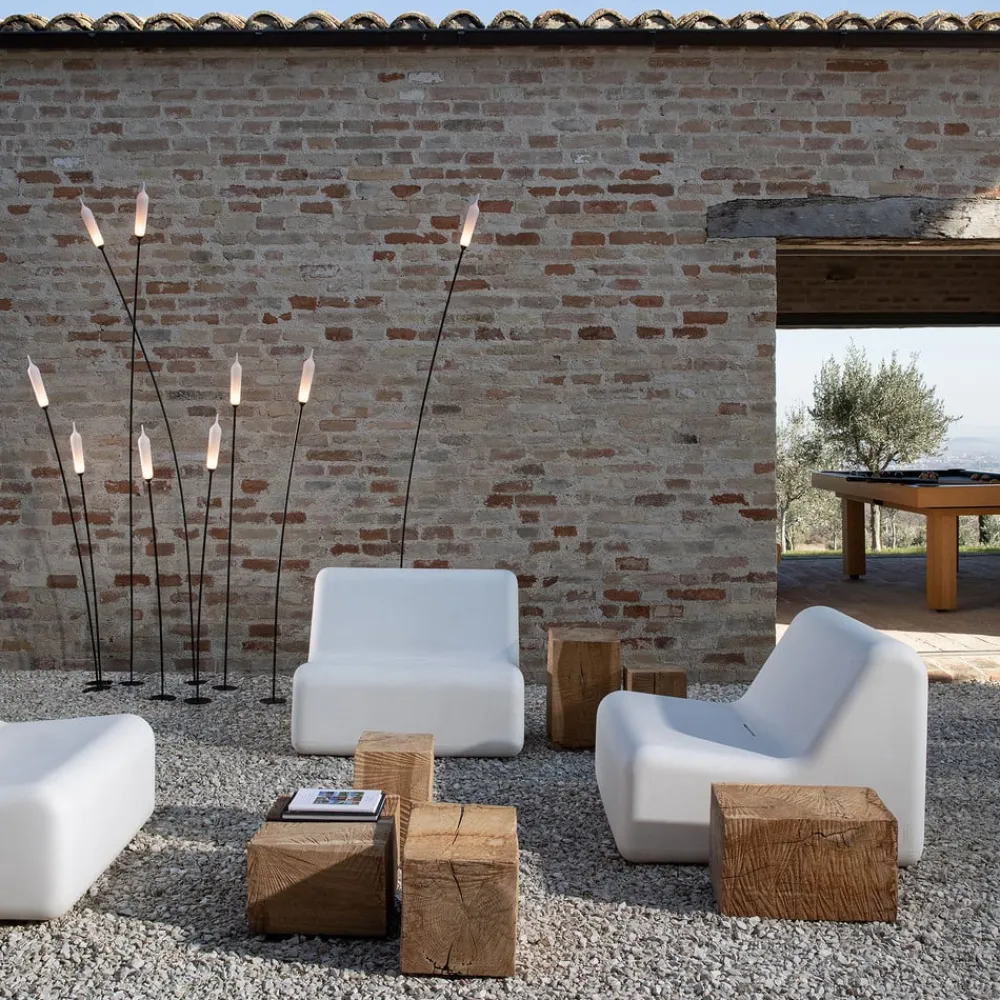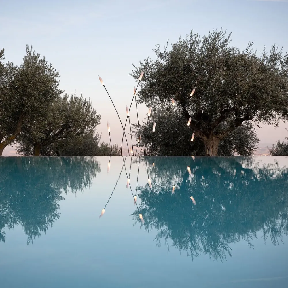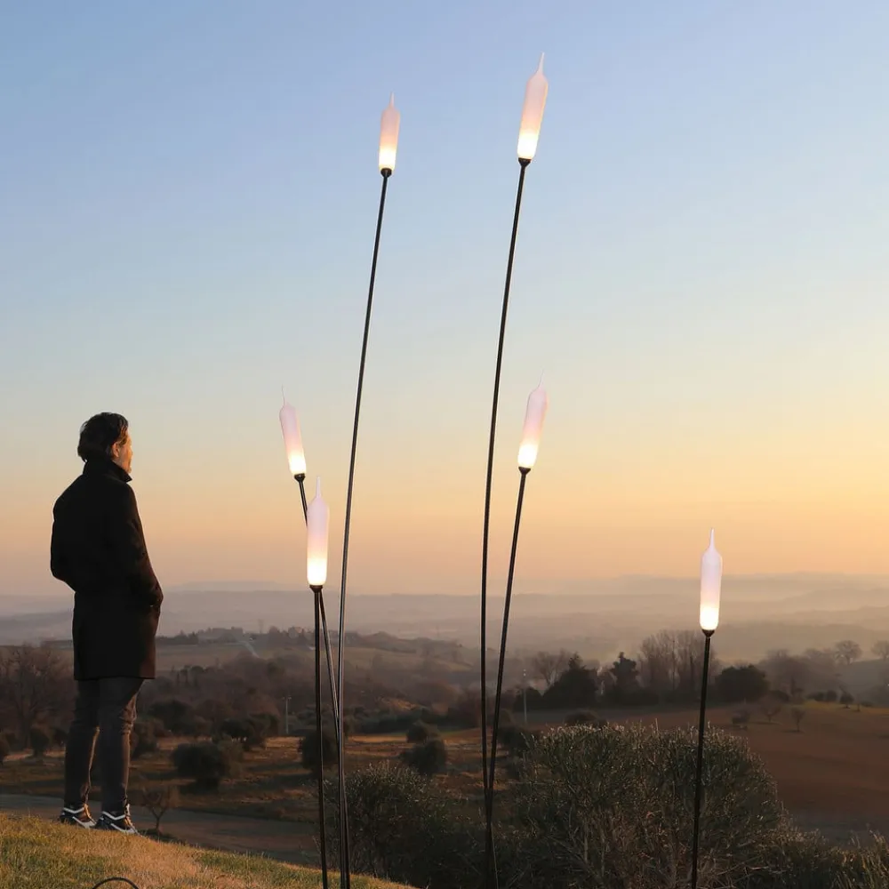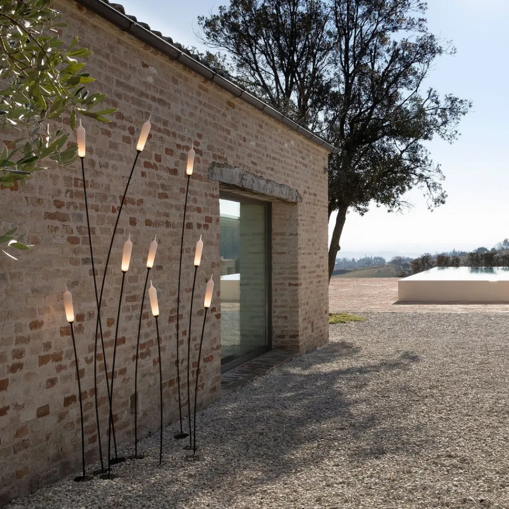 Filigran Nilo LED-jordspydlampe med fint støbt lyskilde i resin Nilo-jordspydlampen er skabt af designeren Matteo Ugolini, som med dette kunstværk endnu en gang udtrykker sin nærhed til naturen. Den er beregnet til udendørs brug, hvor den er mest visuelt tiltalende. Den sofistikerede, interessante form er resultatet af erindringer om en sommereftermiddag, hvor man betragtede det harmoniske samspil mellem en flod og de planter, der vokser der. Visuelt minder gulvlampen stærkt om siv, der synes at svaje i vinden. Udstyret med et jordspyd kan den placeres næsten overalt på blødt underlag og kan også bruges i nærheden af vand takket være IP65. Den yndefulde aluminiumsstang buer mod himlen, ligesom planter orienterer sig mod solen. Den flotte lyskilde, som er lavet af resin og er helt hvid i farven, er placeret i den øverste ende. Den let mælkeagtige finish giver et diffust lys, som opleves meget behageligt og fremhæver LED’ernes varmhvide lysfarve endnu tydeligere. Derudover resulterer det høje farvegengivelsesindeks i en meget naturlig og udtryksfuld opfattelse af farverne i de umiddelbare omgivelser. Lyset sendes ud hele vejen rundt og skaber en delikat accentbelysning. Især brugen af flere af disse jordlamper fremkalder spændende lyseffekter og sætter scenen for ethvert udendørs område. Den italienske belysningsproducent Karman grundlagde sin virksomhed i Italien i 2005 og bestræber sig på at kombinere tradition og modernitet i deres innovative lamper. Fokus er på at bruge utraditionelle materialer for at skabe interesse for produkterne – inkl. 5 meter kabel og vandtæt kabelmuffe – transformer medfølger ikke (se tilbehør)
