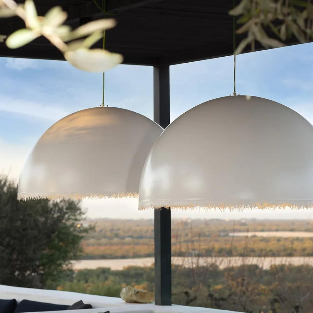 Plancton designerpendel til udendørs brug Den italienske belysningsproducent Karman lægger vægt på gennemtænkte koncepter, design af høj kvalitet og en særlig lyseffekt. LED-pendlen Plancton scorer også højt på disse egenskaber, og designer Matteo Ugolini har ladet sig inspirere af de allestedsnærværende mikroorganismer i havet, plankton. Den flydende karakter af deres bevægelse er implementeret i pendlen ved hjælp af flossede fiberender i skærmens nederste kant. Materialet til Plancton er glasfiber, som er forarbejdet til et tæt stof. Den hvide halvkugleformede skærm, som er åben forneden, er velegnet som en lysende accent i udendørsområder og giver også direkte belysning på verandaen eller terrassen. Det 5 meter lange kabel kan vikles op over bjælker osv. for at skabe en passende ophængningshøjde.