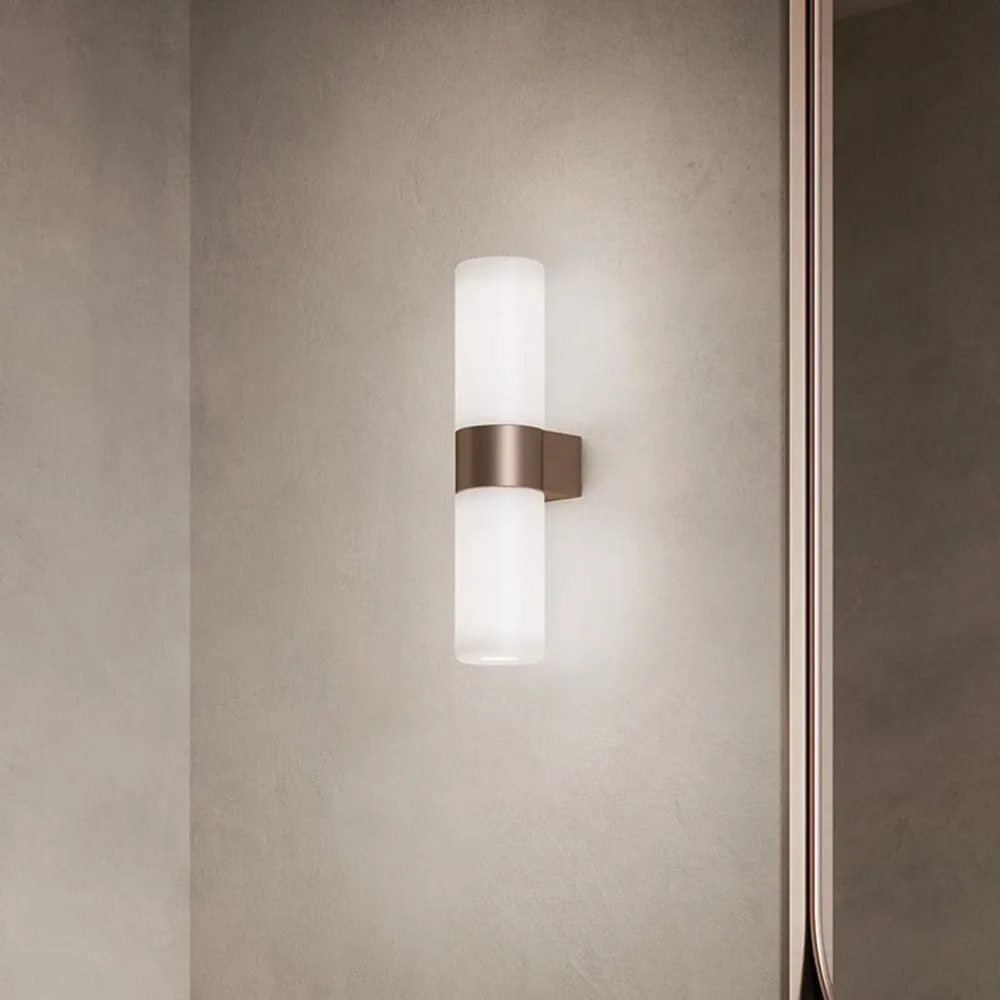 Væglampe Pastilla er udtryk for moderne purisme. Den består af to runde glascylindre, der er adskilt af en vægholder i hvidlakeret metal. Glasset er presset og ætset, hvilket giver det en mælkeagtig karakter. Lyset fra de to E14-pærer (medfølger ikke, se tilbehør) spredes jævnt rundt.