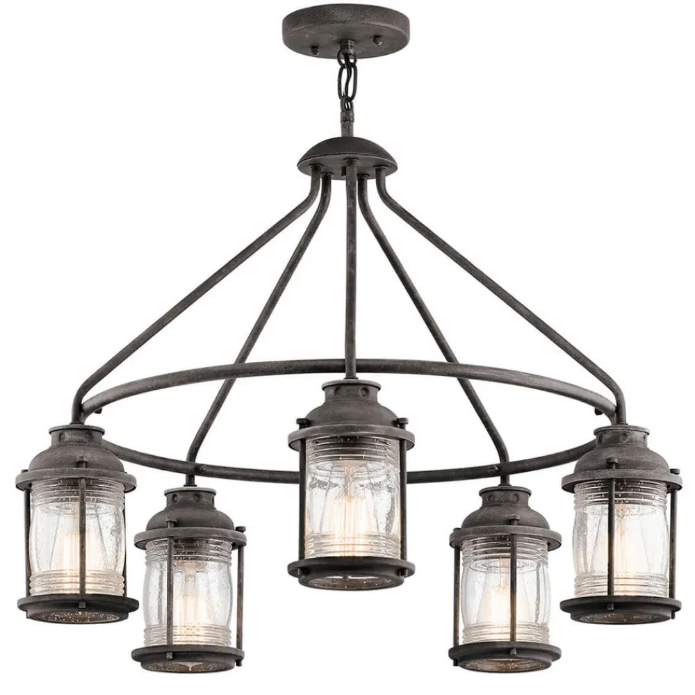 Ashland Bay-hængelampen, lavet i et forvitret zinkdesign, har fem lanterneformede lys og udstråler et strejf af kolonial flair i hele sit udseende. Er illuminanter sådan. B. glødelamper i kulfilamentoptik, den dekorative effekt er mest effektiv.