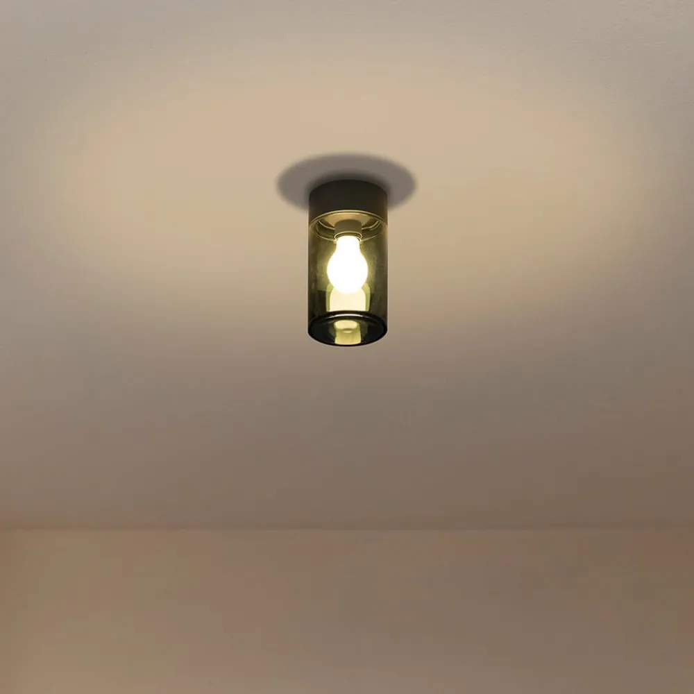 Kila udendørs loftslampe er fremstillet af antracitfarvet aluminium. Den cylindriske skærm af glas, hvori en E27-fatning venter på en effektiv LED-lampe på højst 15 watt, er problemfrit forbundet.