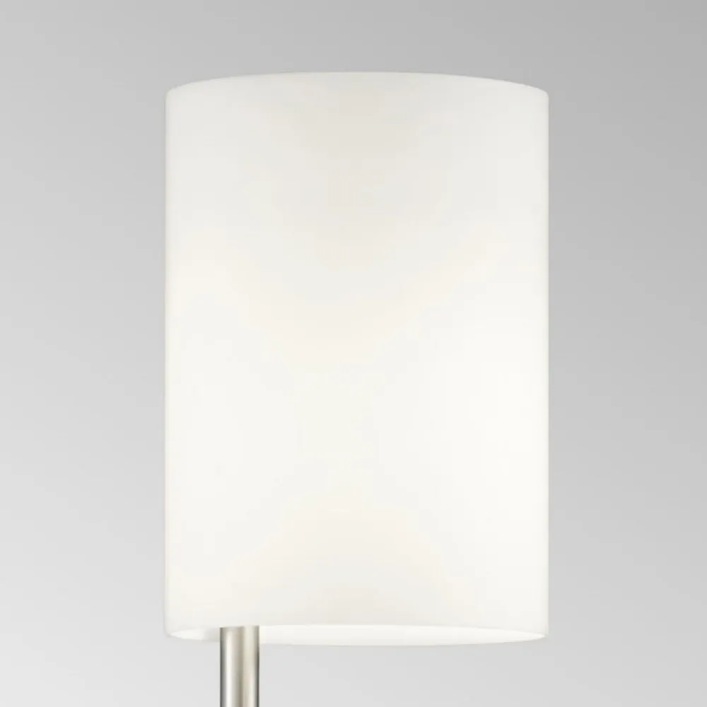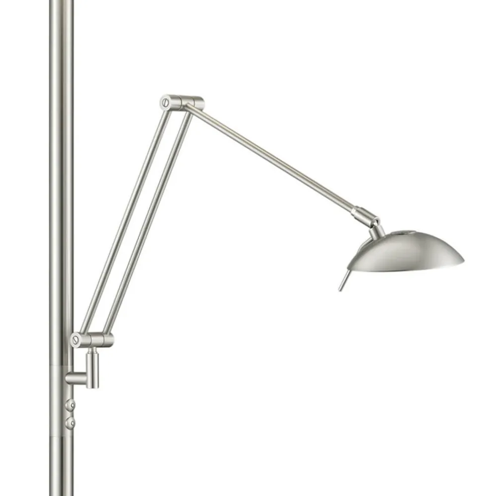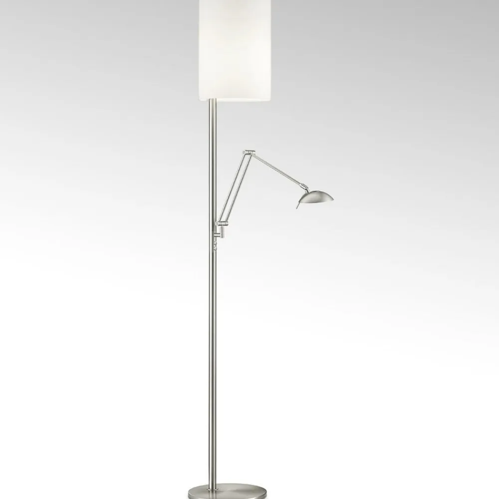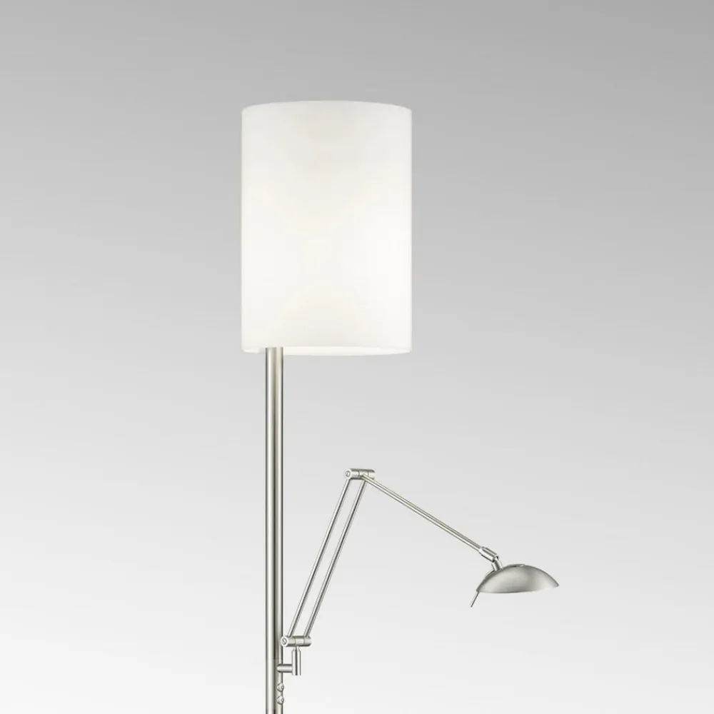 Energibesparende Nola LED-gulvlampe i mat nikkel-look Den multifunktionelle Nola LED-gulvlampe er en moderne energibesparer, for takket være LED-teknologien kan denne tidløst moderne lampe prale af et relativt lavt strømforbrug. Derudover kan gulvlampen i mat nikkel-look bruges på mange måder takket være læsearmen. Hvis det ønskes, bader den ikke kun hele rummet i et hyggeligt lys, men giver også behageligt fokuseret lys til læsning. Læsearmen kan justeres fleksibelt og kan derfor bruges præcis der, hvor der er brug for den. Den mat hvide opalglasskærm sikrer også, at Nola-armaturet passer diskret ind i næsten ethvert boligkoncept. Uanset om det er i stuen eller i soveværelset, kommer LED-lampen med sin puristiske underdrivelse til sin ret i en lang række rum. Den ønskede atmosfære kan også skabes takket være den praktiske lysdæmper, fordi det centrale lys kan dæmpes via berøringsdæmperen i lampeskaftet, mens lysdæmperen til læselyset er placeret i selve reflektoren.