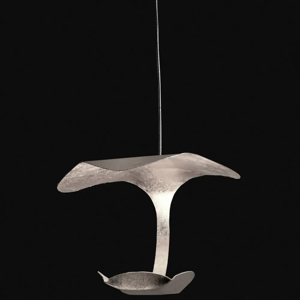 Designer pendellampe Le Gigine – den naturligt udseende lyskilde til ethvert rumDette fascinerende lysobjekt minder om en plante, især dens blade og blomster. Le Gigine er diskret buet og åbent hele vejen rundt og synes at svæve. Det spreder en følelse af lethed og skaber desuden en meget blød belysning. Når lyset tændes, ser det ud som om en ren, opkvikkende lysstråle kommer ud af et bæger, der er indlejret i den bladformede nederste del af det yndefulde armaturhus. Lysstrålen reflekteres af det øverste element af armaturet og bliver således sendt lyst og bredt ud i rummet.LED-pendelarmaturet af hamret stål hænger i et knap synligt silikonekabel og er ideelt som accentbelysning og et ægte blikfang i ethvert rum. Dens fine linjer er dekoreret med tiltalende farver og får den til at fremstå meget elegant.- dæmpbar via fasedel