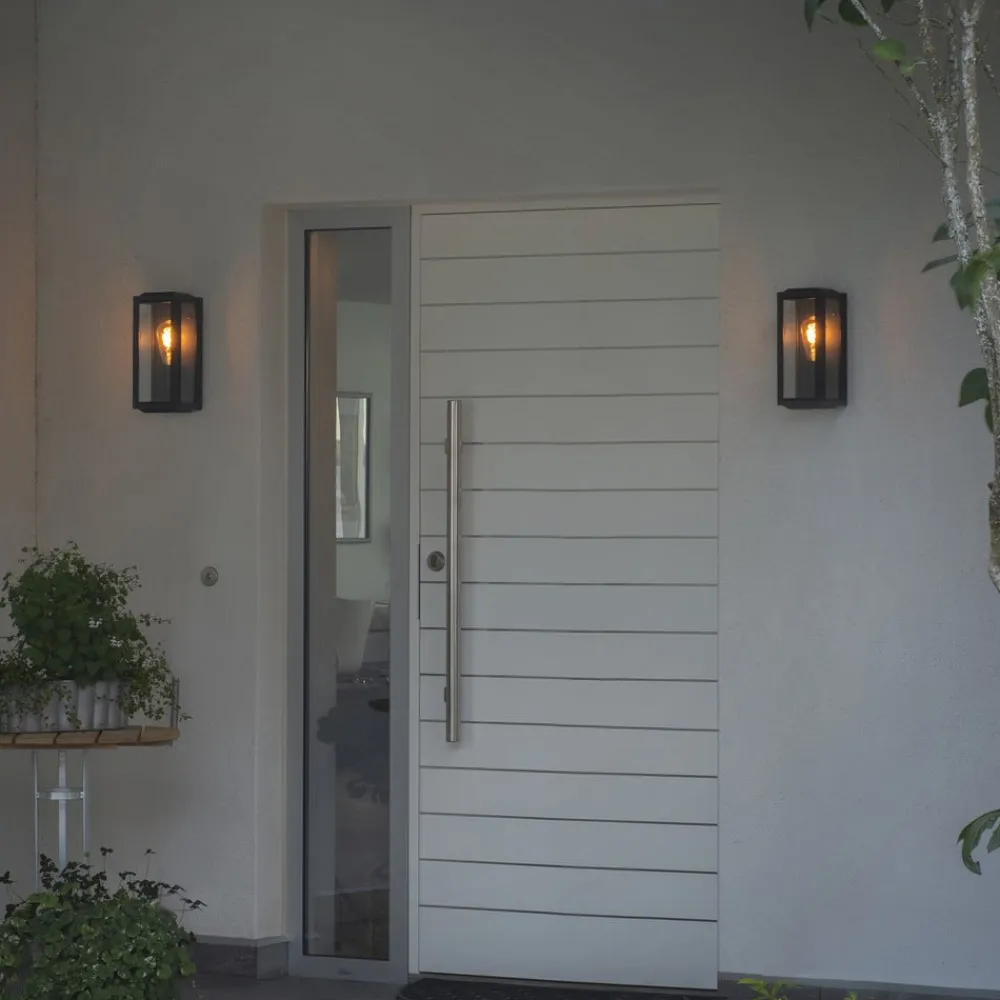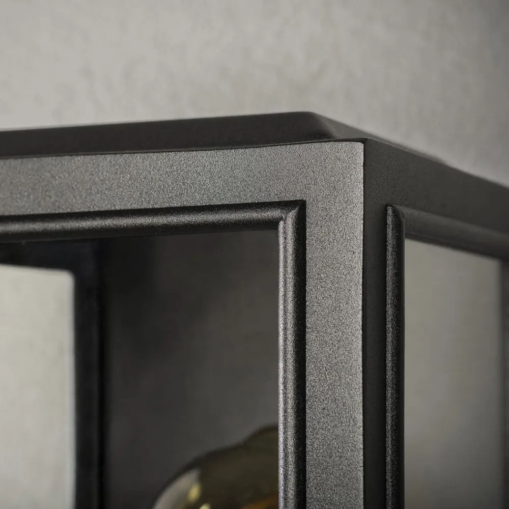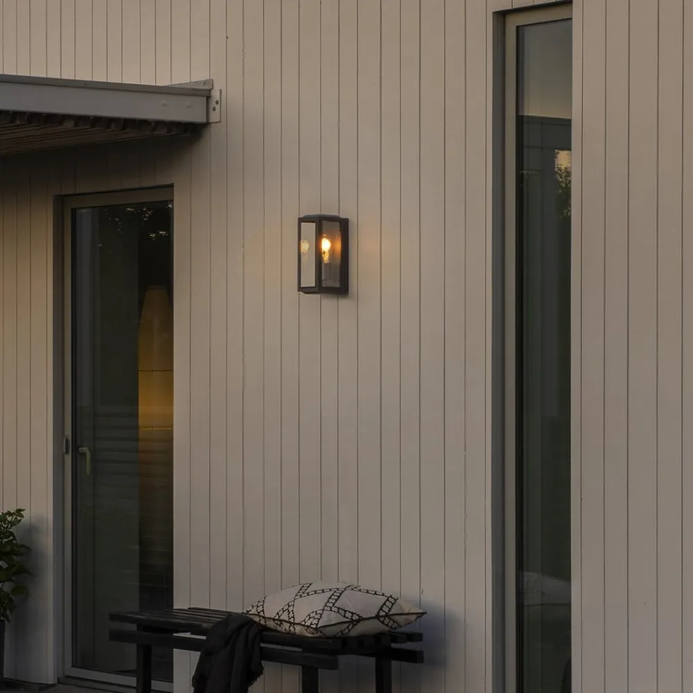 Carpi kubisk udendørs væglampe med klare glasoverflader Denne udendørs væglampe er det perfekte udgangspunkt for at tilføje en dekorativ lysaccent til et moderne udendørsområde. Carpi er designet som en åben, sort kubus. Den lukkede bagside og stiverne foran er fremstillet af aluminium og lakeret med en sort pulverlakering. Overfladerne er dækket af klare glasruder, der giver udsyn til lyskilden, som er indsat i den opadvendte fatning. Visuelt harmoniserende lamper fås som tilbehør.