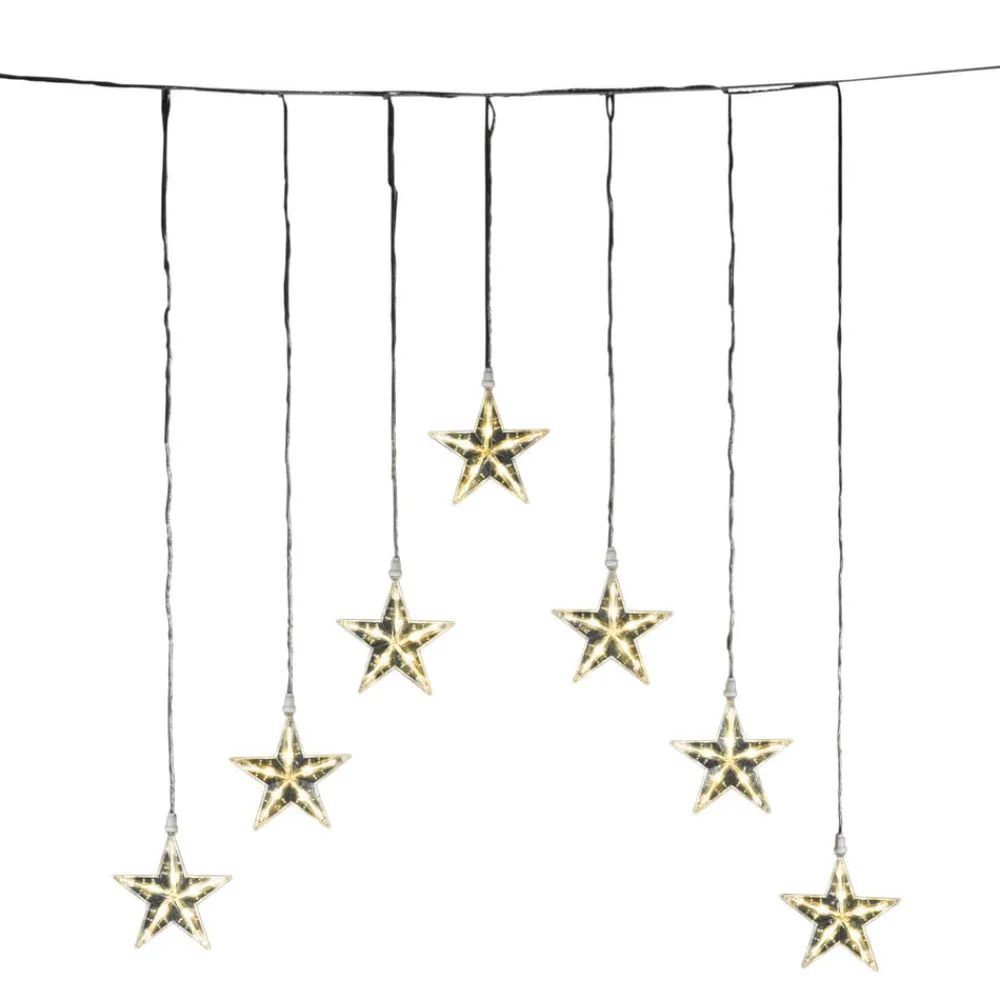 Varmhvidt LED-lysgardin med 7 stjerner til udendørs brug – inklusive udendørs transformer – gennemsigtigt kabel – højde på stjerner 12 cm