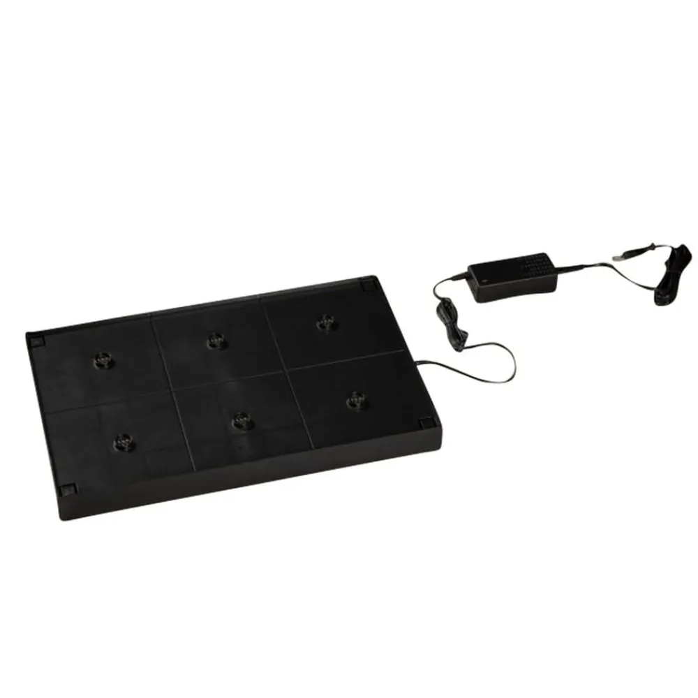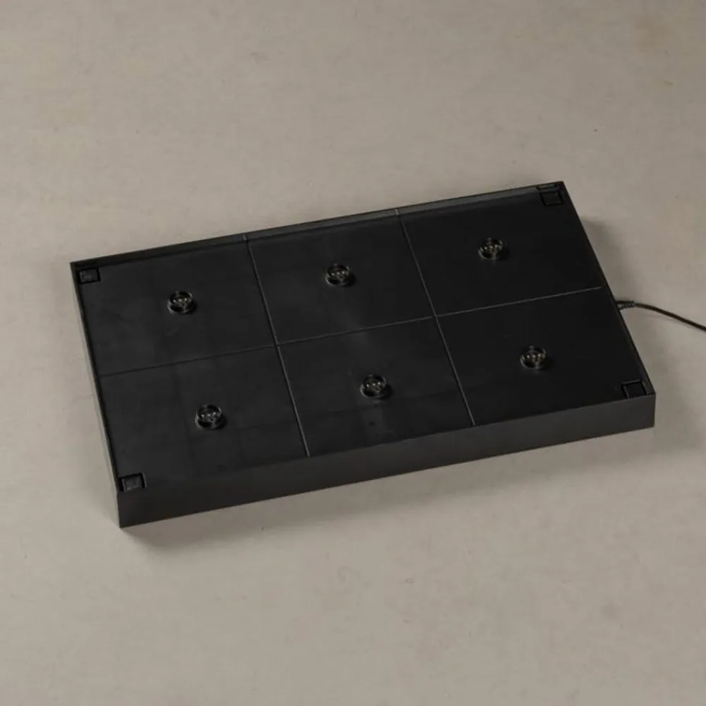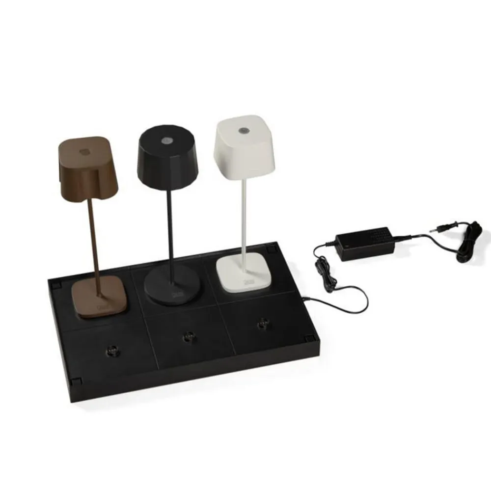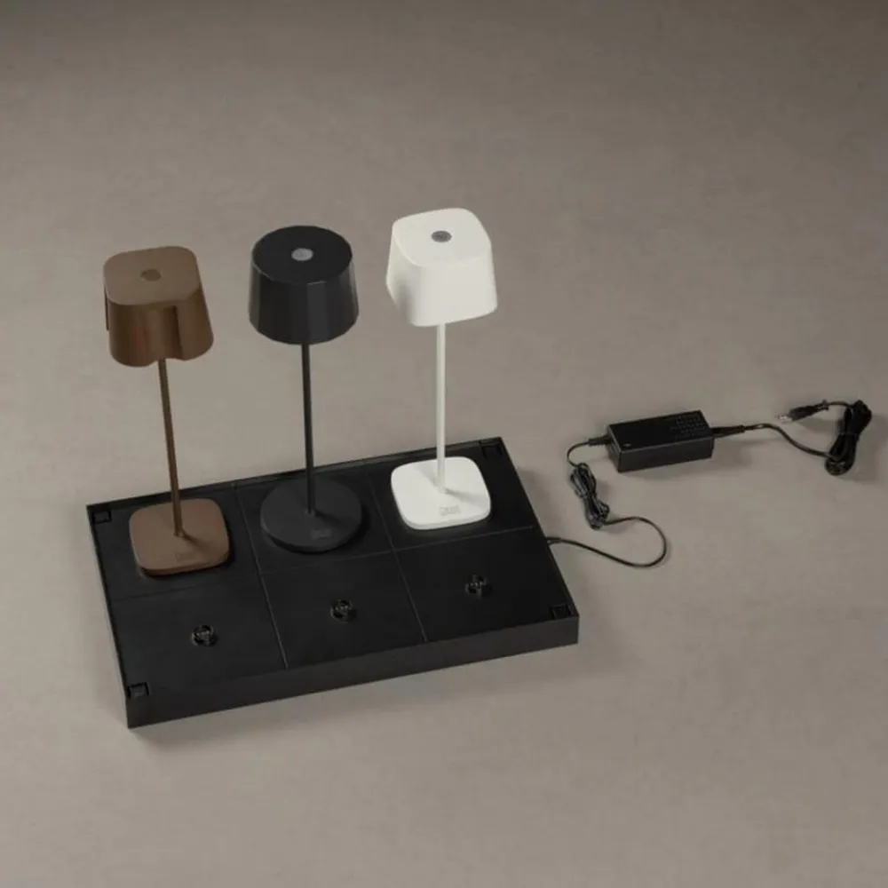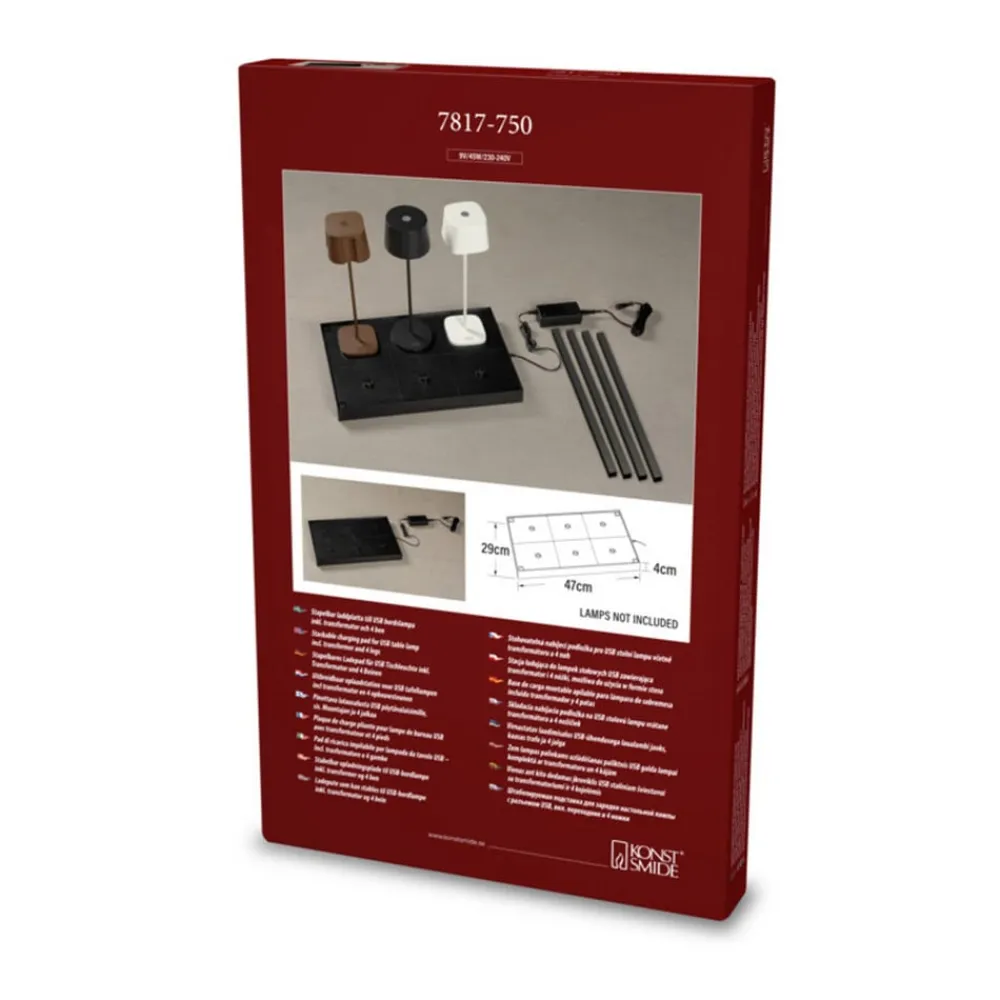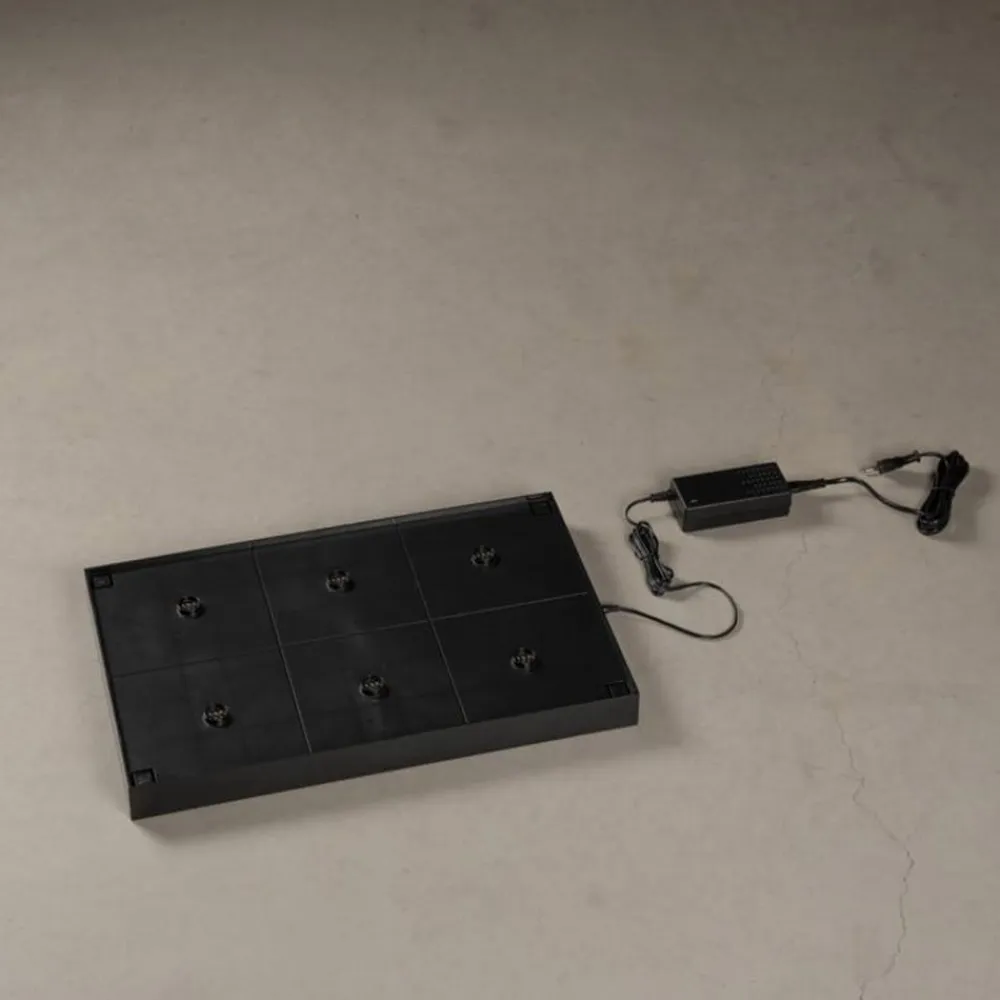 Ved hjælp af denne ladestation kan op til seks Nice LED-batterilamper oplades på samme tid. De medfølgende bordben gør det muligt at hæve ladestationen til en bekvem højde, så batterilamperne hurtigt og nemt kan oplades på den.